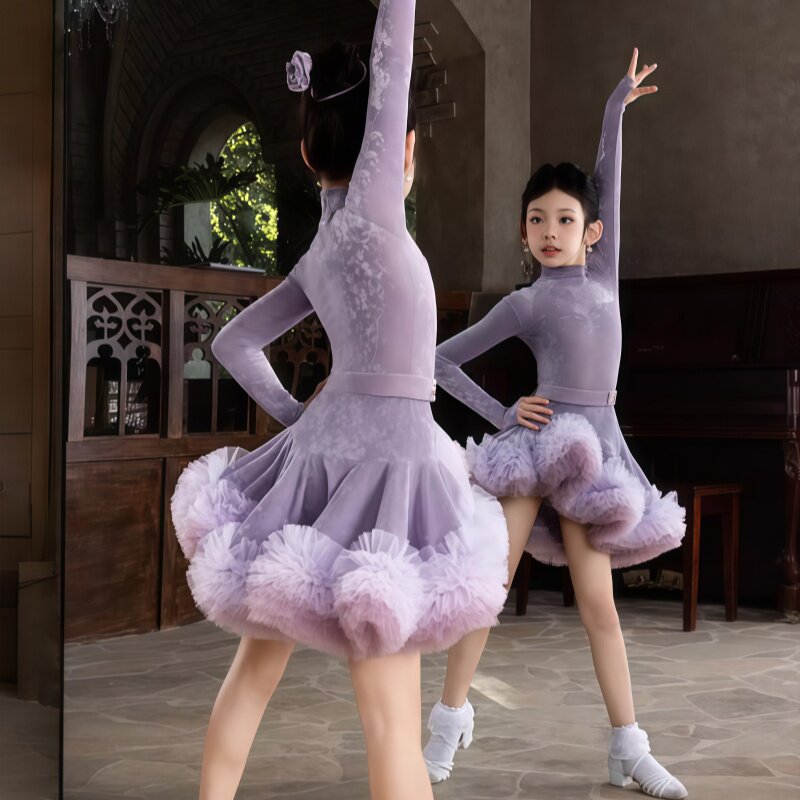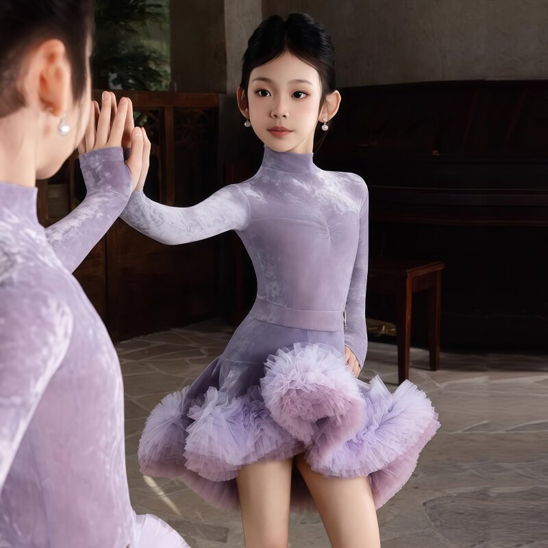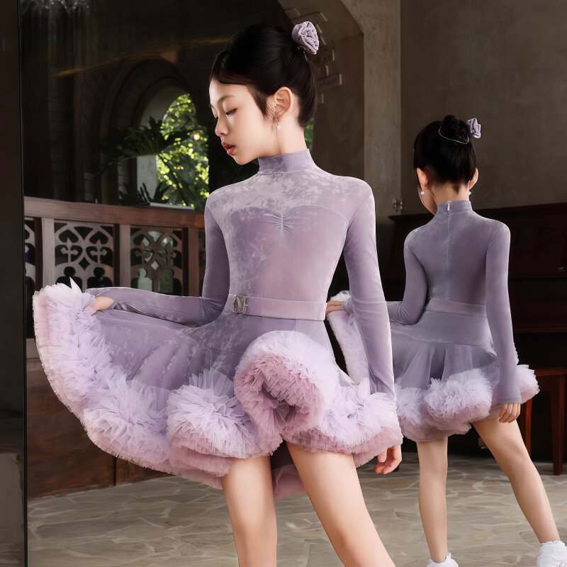 春季新款女童拉丁舞比赛服高领长袖连体上衣蓬蓬裙套装表演演出服