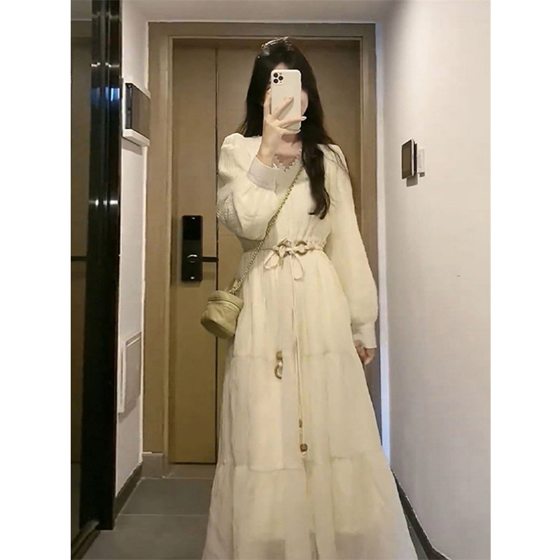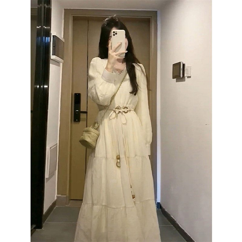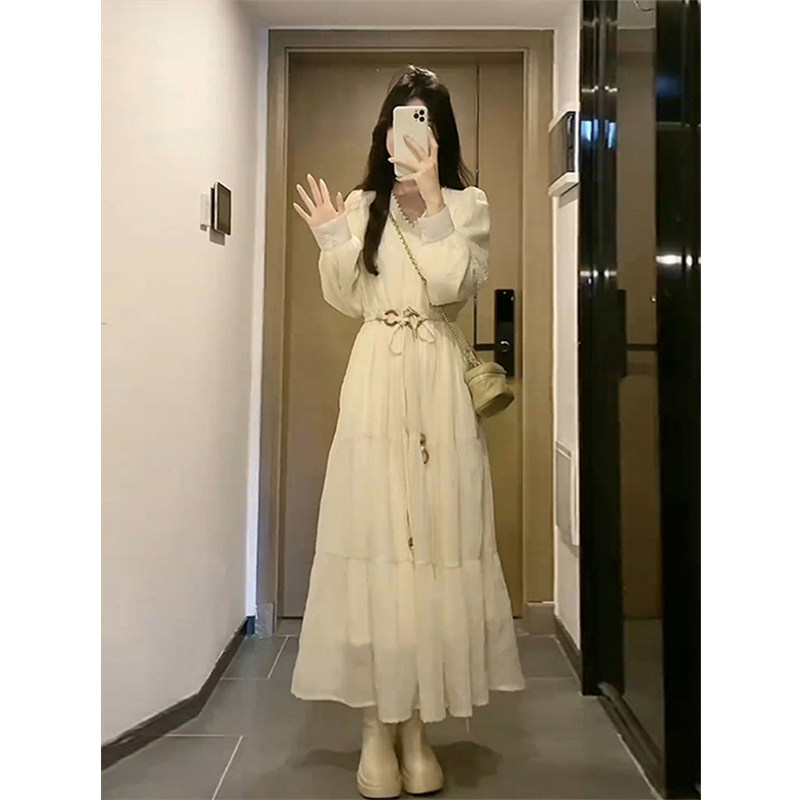 秋冬季法式温柔风长袖连衣裙女2024小个子新款气质甜美V领长裙子