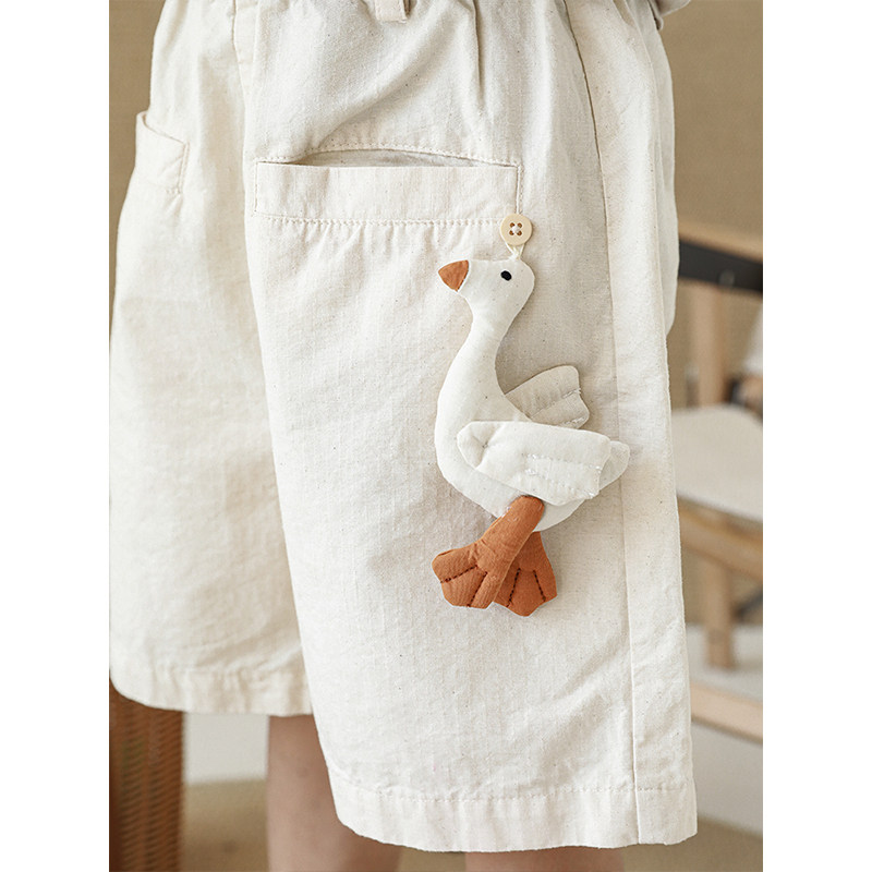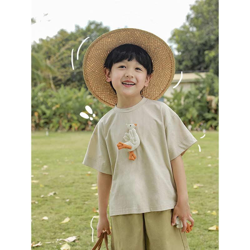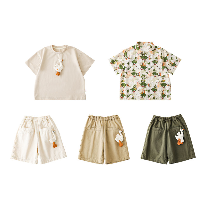 幼悠 夏季儿童风景印花V领衬衫手工大鹅玩偶宽松短袖T恤短裤套装