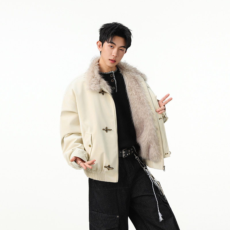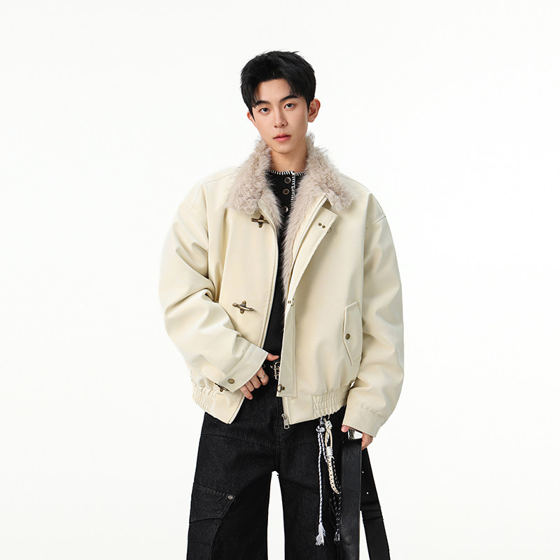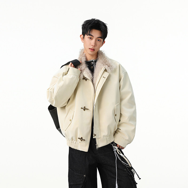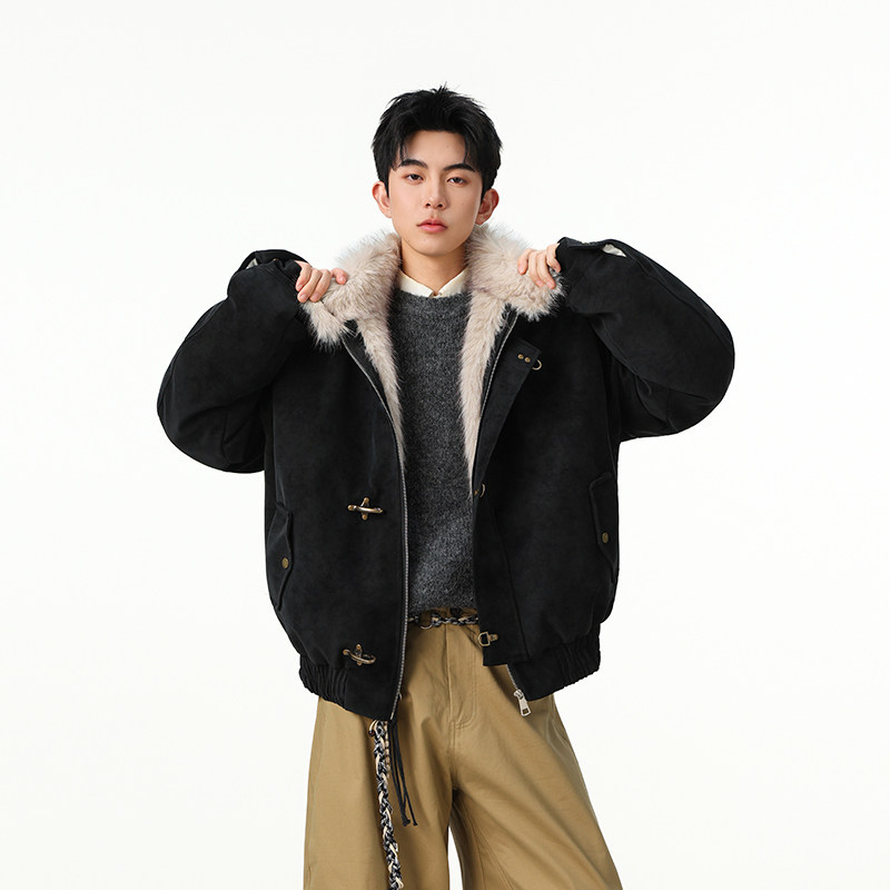 冬季飞机扣座山雕棉衣男款美式痞帅高级感重磅加厚毛领PU皮外套