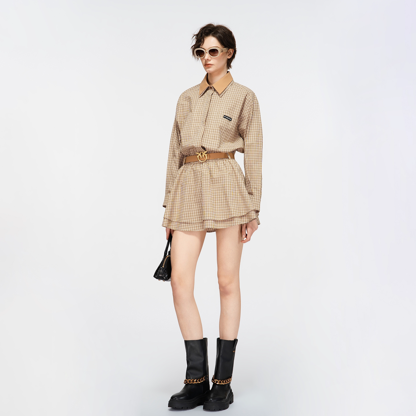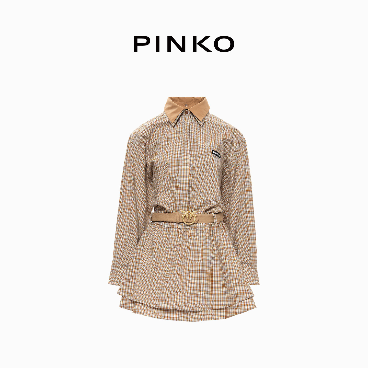 PINKO女士2026春季新款卡其格纹双层翻领连衣裙PAF26170326