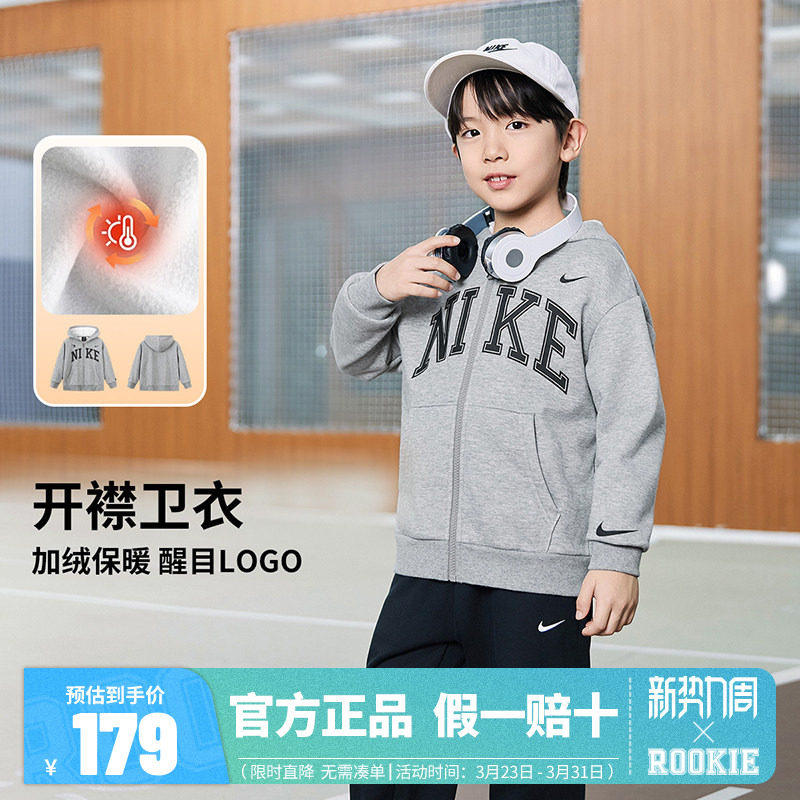 Nike 3brand儿童卫衣开衫男童加绒上衣2025冬季童装运动女童外套
