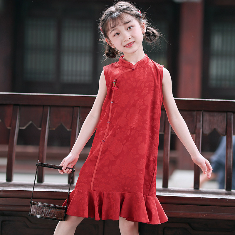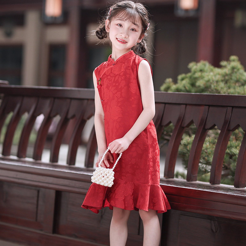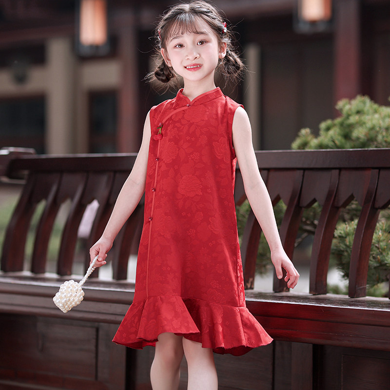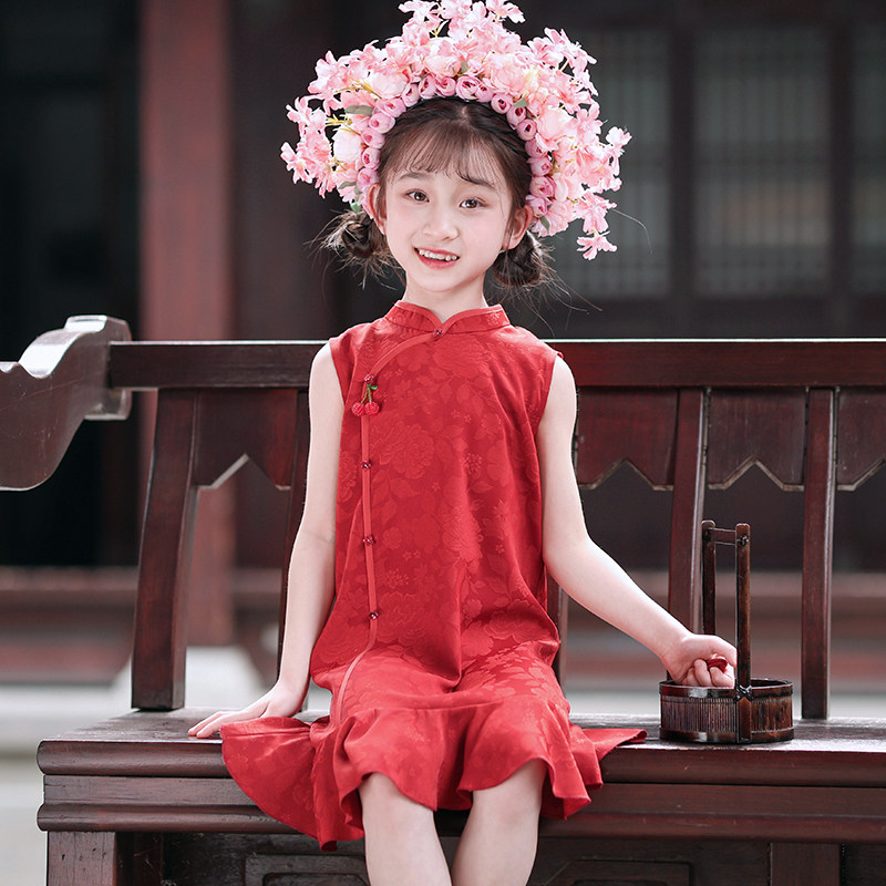 叙罗儿童旗袍夏季无袖中国风连衣裙女童红色小旗袍改良新中式礼服