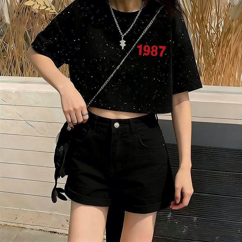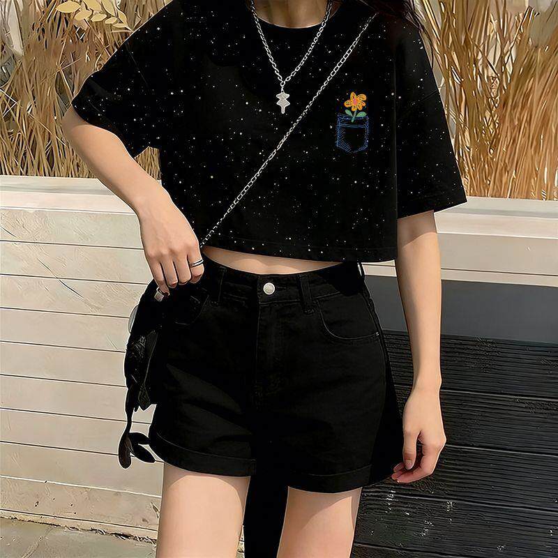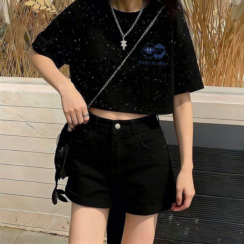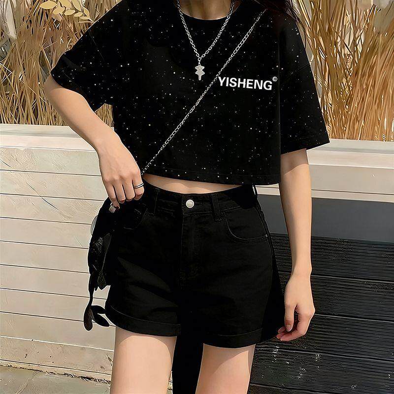 2026年夏天新款满天星亮片短款短袖T恤时尚宽松显瘦百搭女款上衣