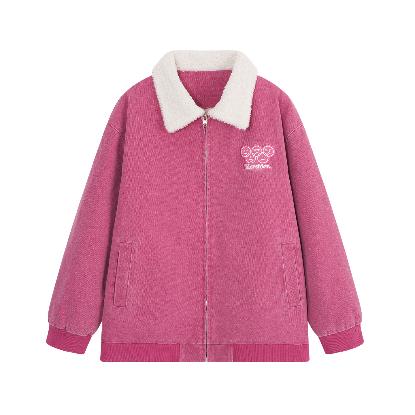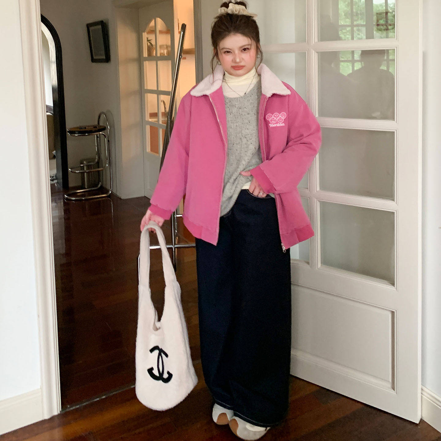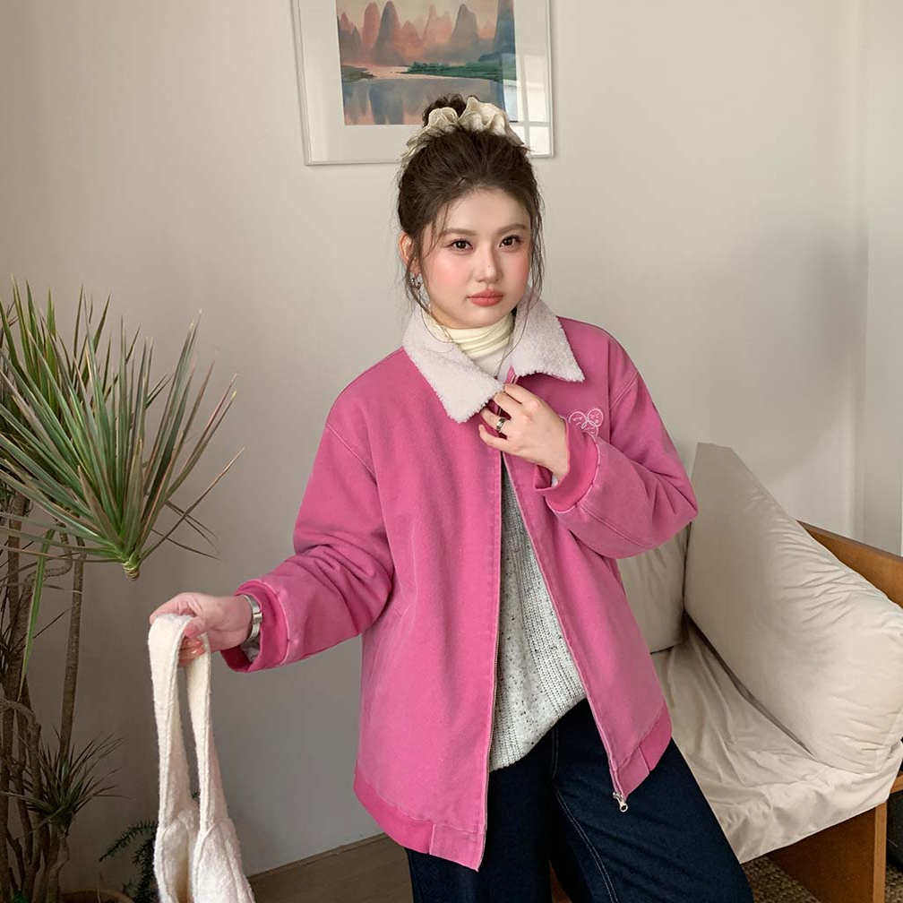 YUZI鱼子加绒加厚玫粉色外套特大码女装复古甜酷宽松毛领春季胖mm