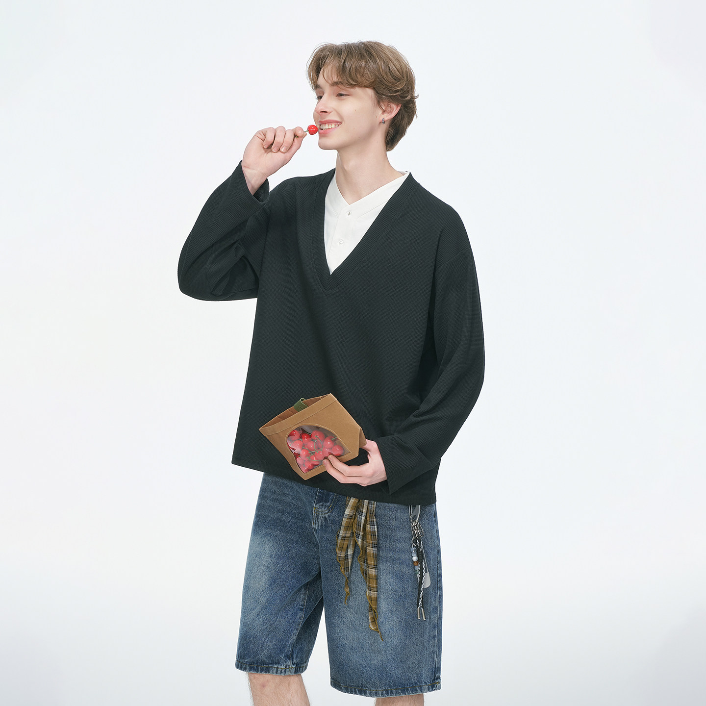 Dream made 老钱风假两件华夫格长袖T恤男款春季人夫感内搭打底衫