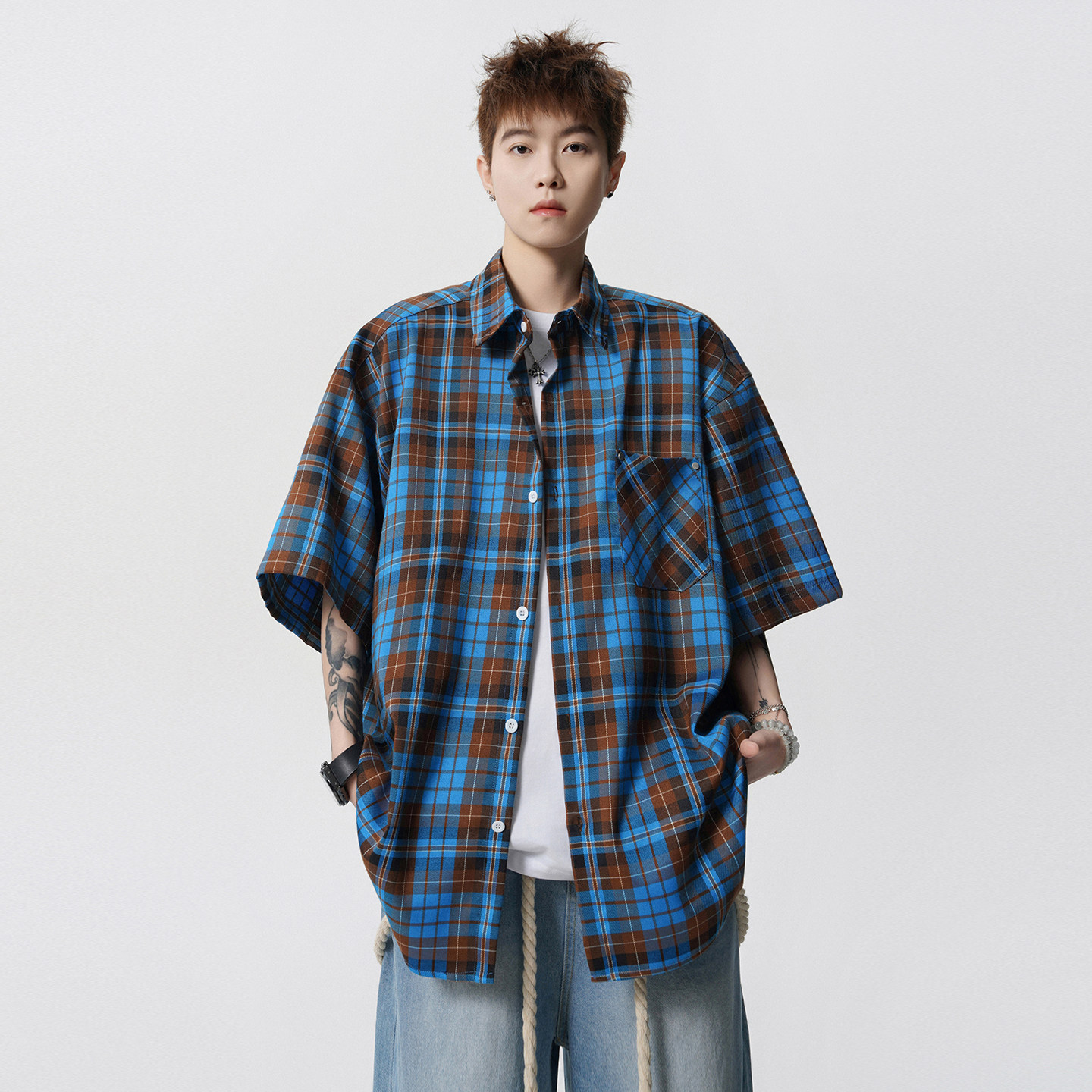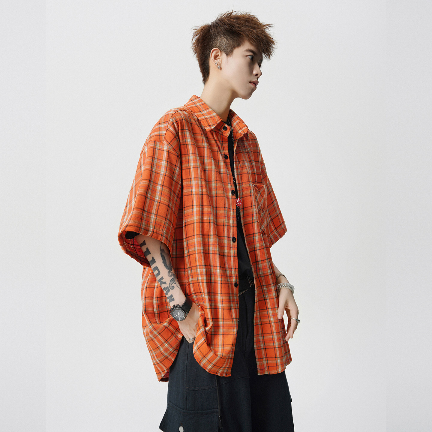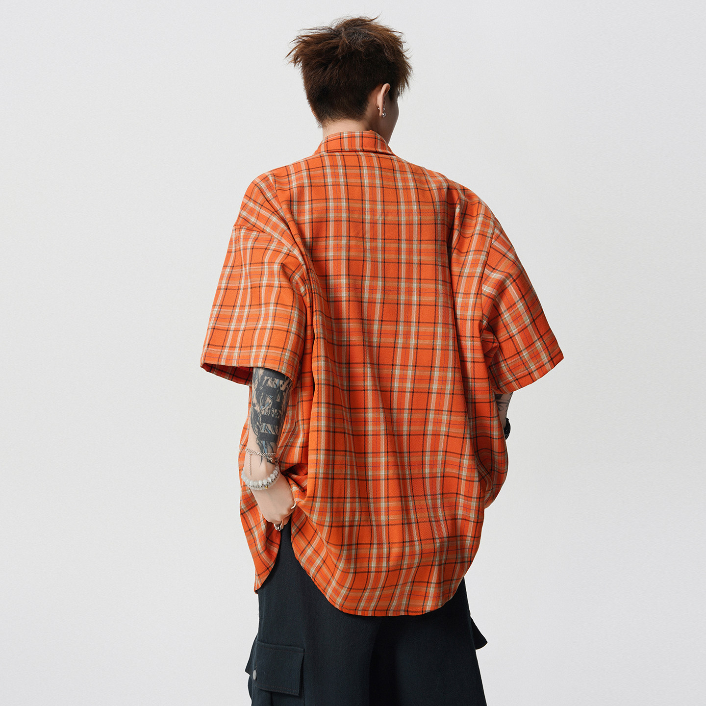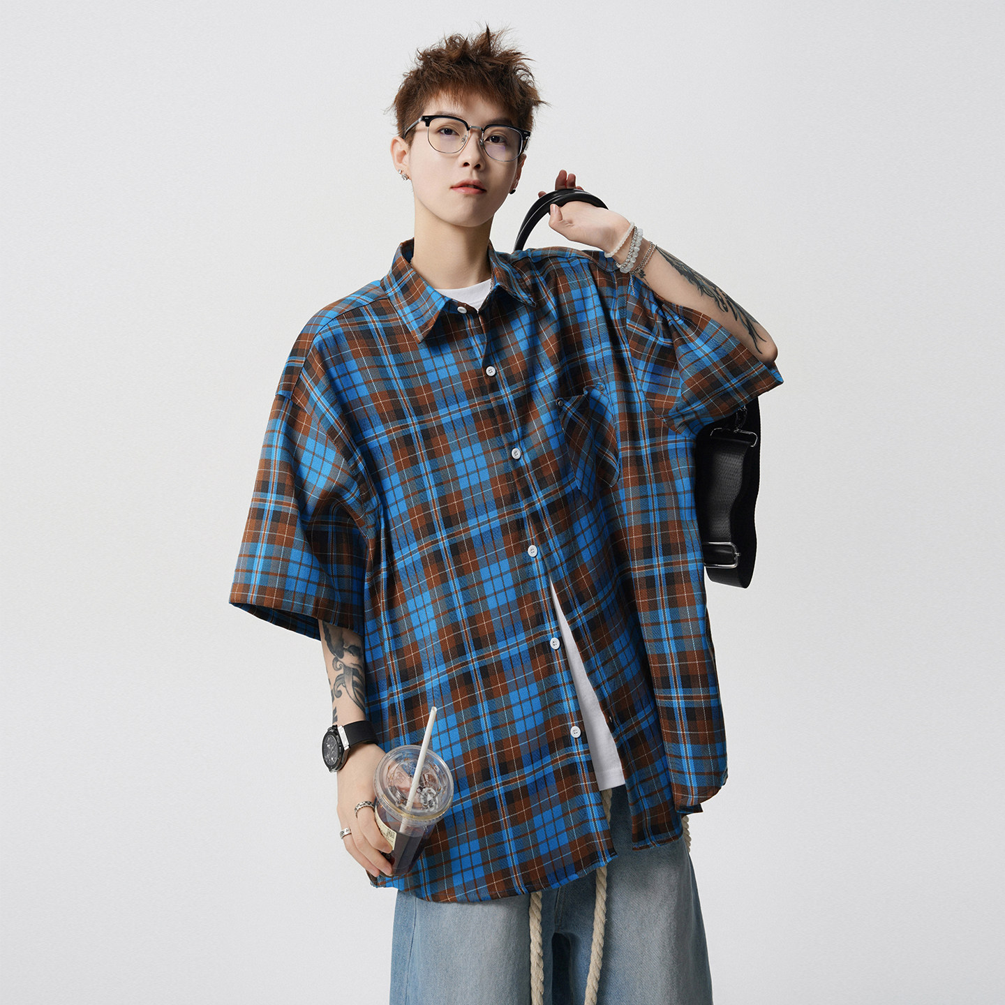 V37多巴胺格纹短袖衬衫男款2026夏季新款青少年情侣宽松半袖衬衣