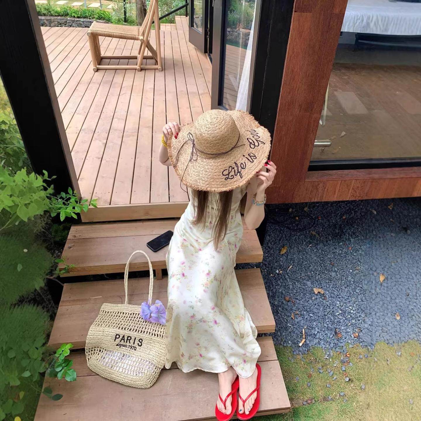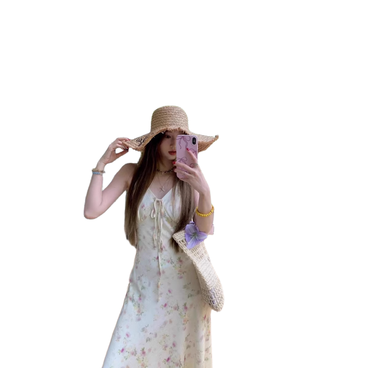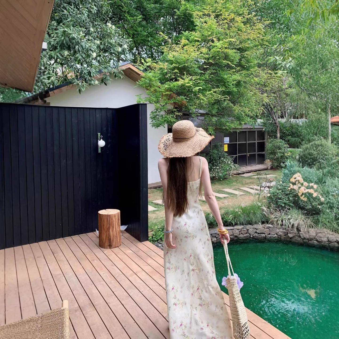 法式度假风袖V领碎花连衣裙女夏季收腰显瘦A字裙温柔风吊带长裙