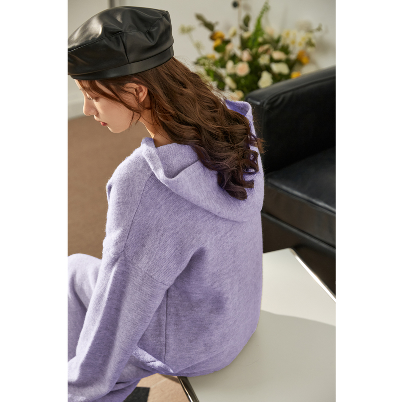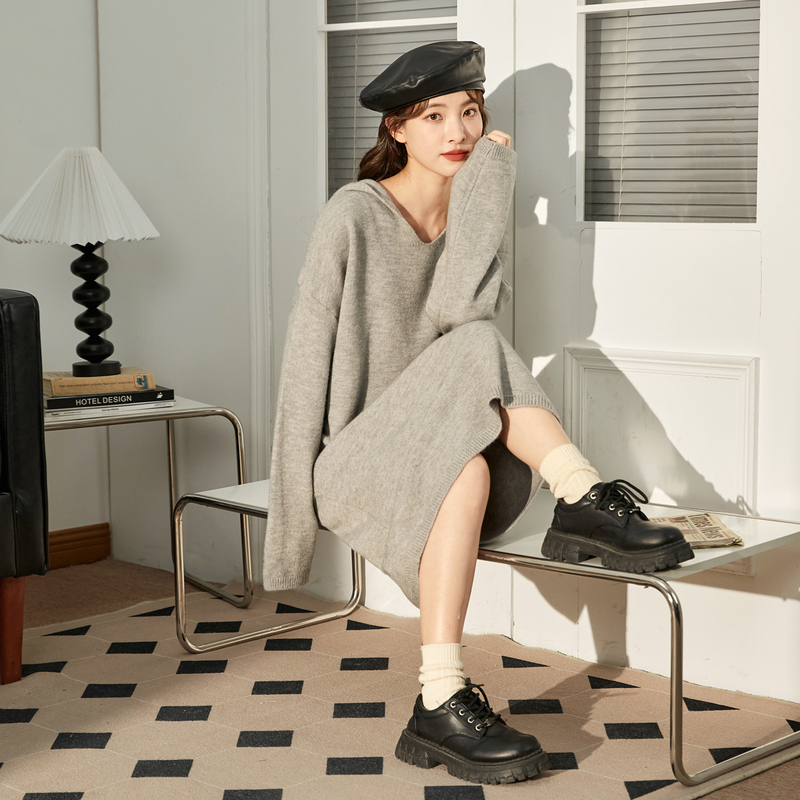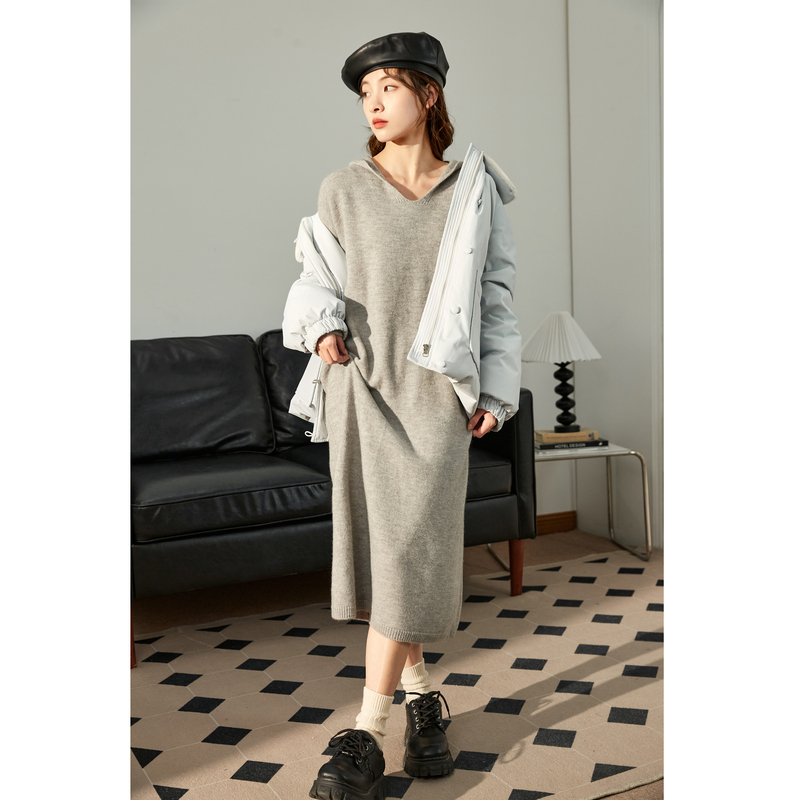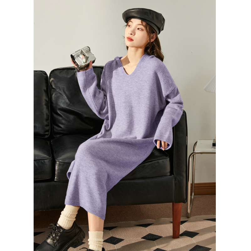 唐狮紫色连帽打底连衣裙女秋冬针织长裙小个子长袖秋装新款女装q2