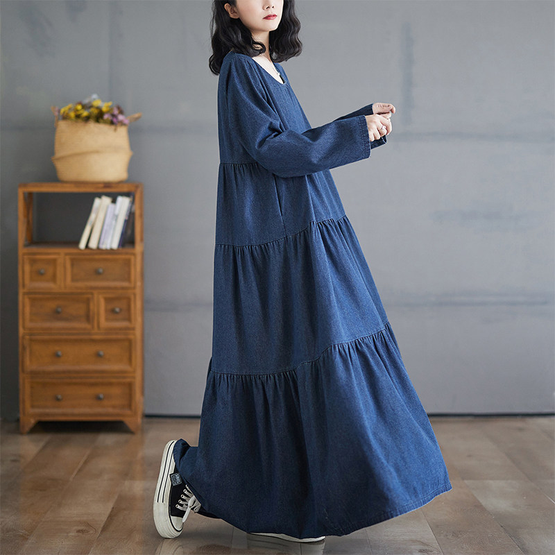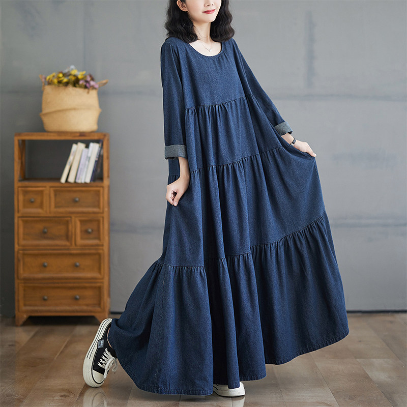 高个子连衣裙春秋款牛仔复古法式长裙宽松长袖大摆裙a字蛋糕裙子
