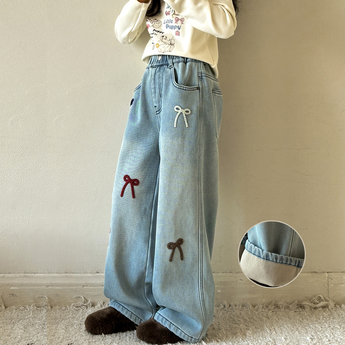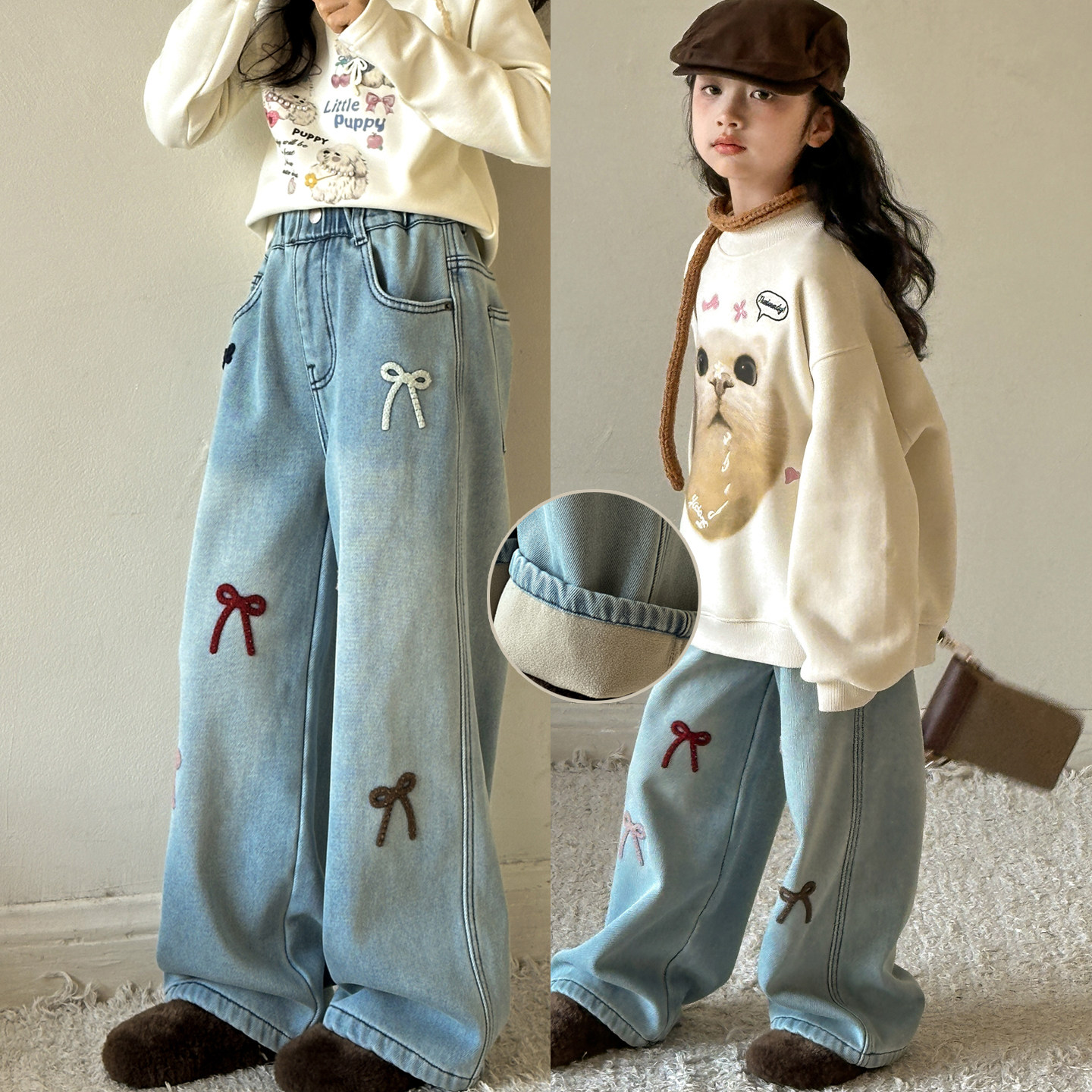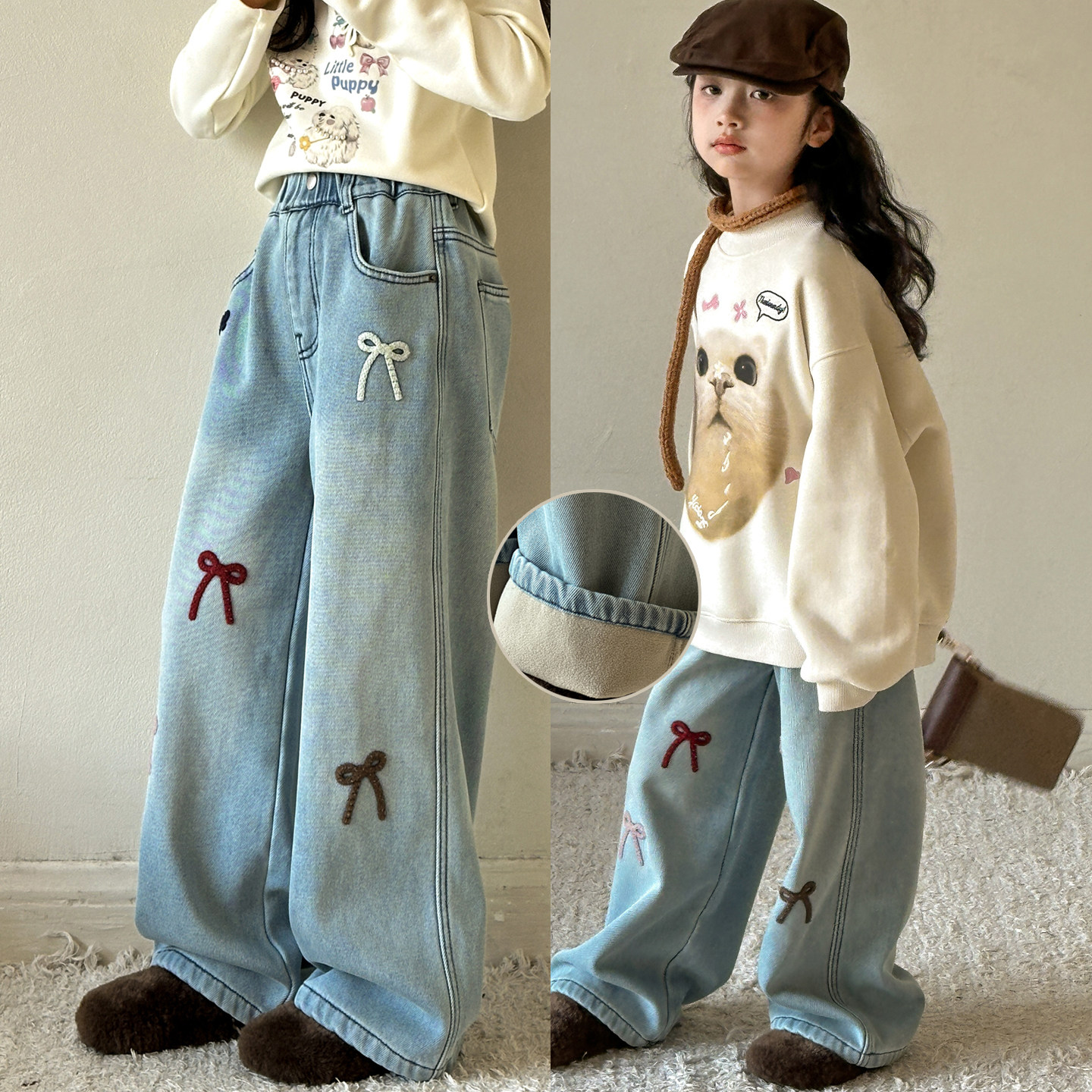 女童加绒牛仔裤2026冬季新款女大童裤子儿童一体绒加厚阔腿直筒裤
