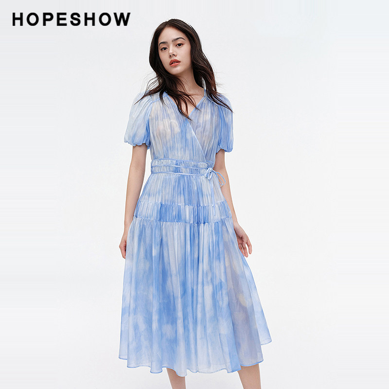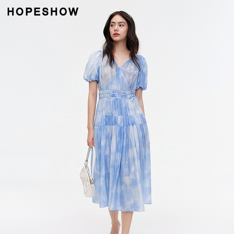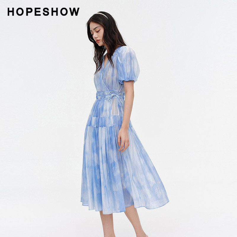【日常价】红袖夏新款女装泡泡袖系带收腰V领连衣裙