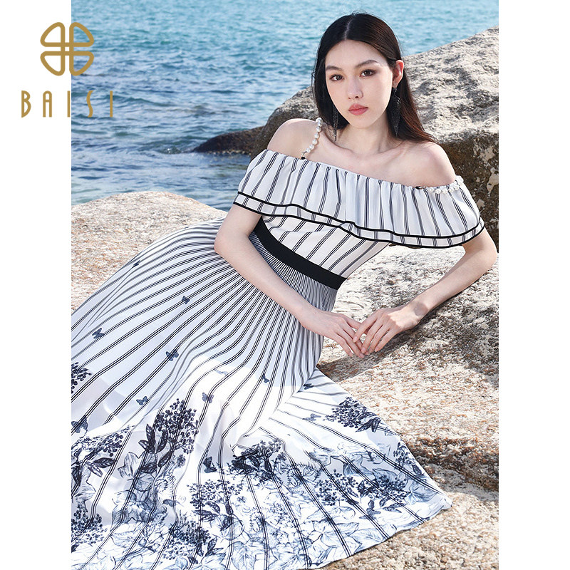 2025夏季新品百丝吊带长裙条纹露肩收腰休闲日常一字肩连衣裙女
