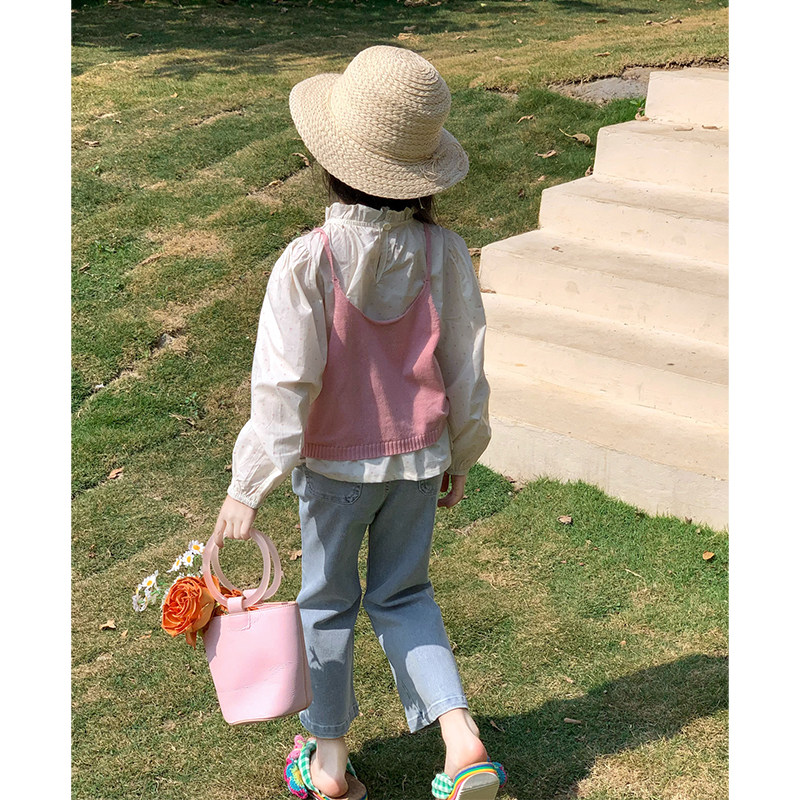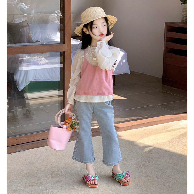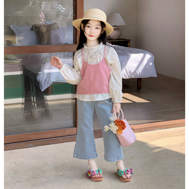 女童春季韩版花边衬衫针织马甲牛仔喇叭裤洋气三件套装2026春装