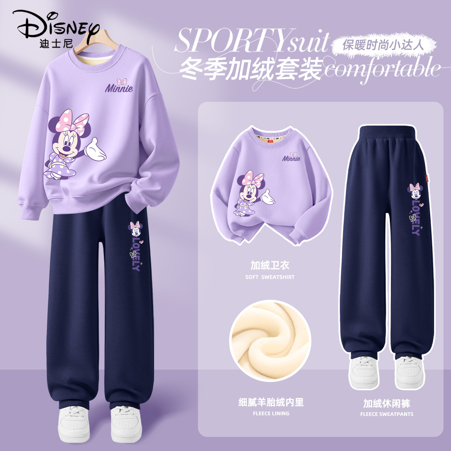 迪士尼女童加绒套装冬天漂亮2025新款女孩紫色羊胎绒卫衣儿童冬装