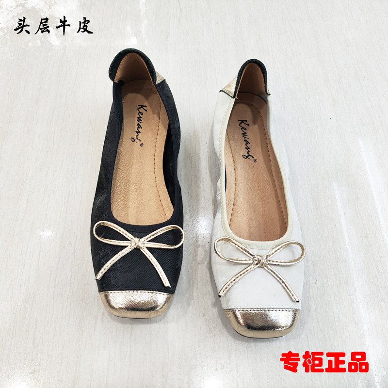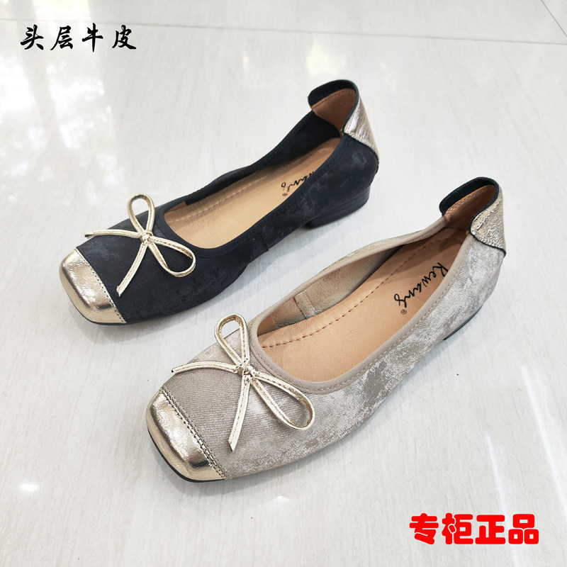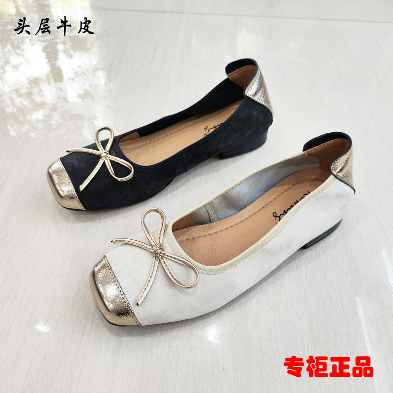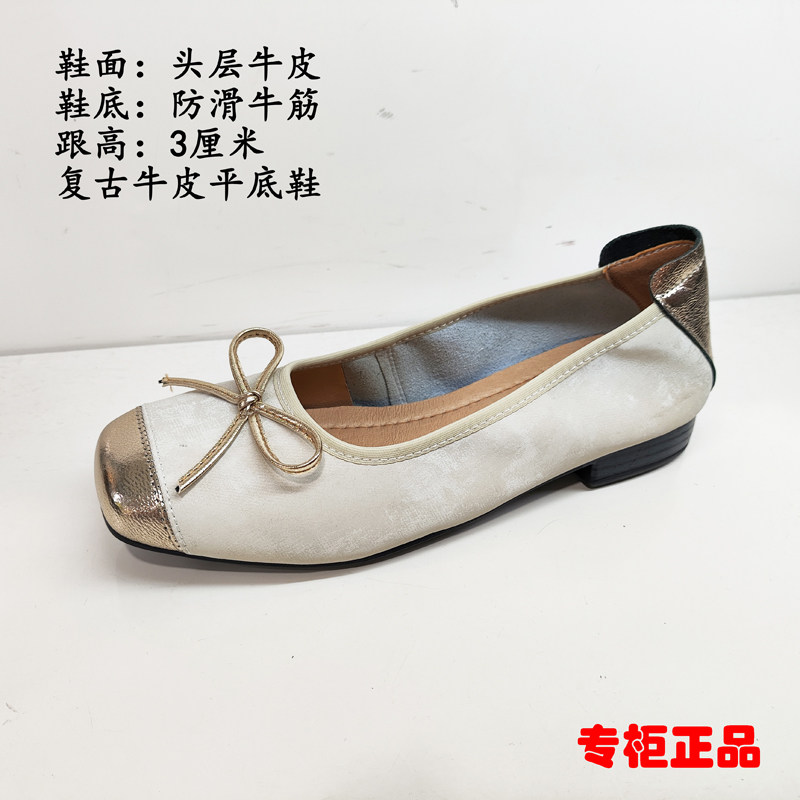 专柜正品女鞋2025春夏秋新款浅口复古牛皮平底单鞋蝴蝶结百搭拼色