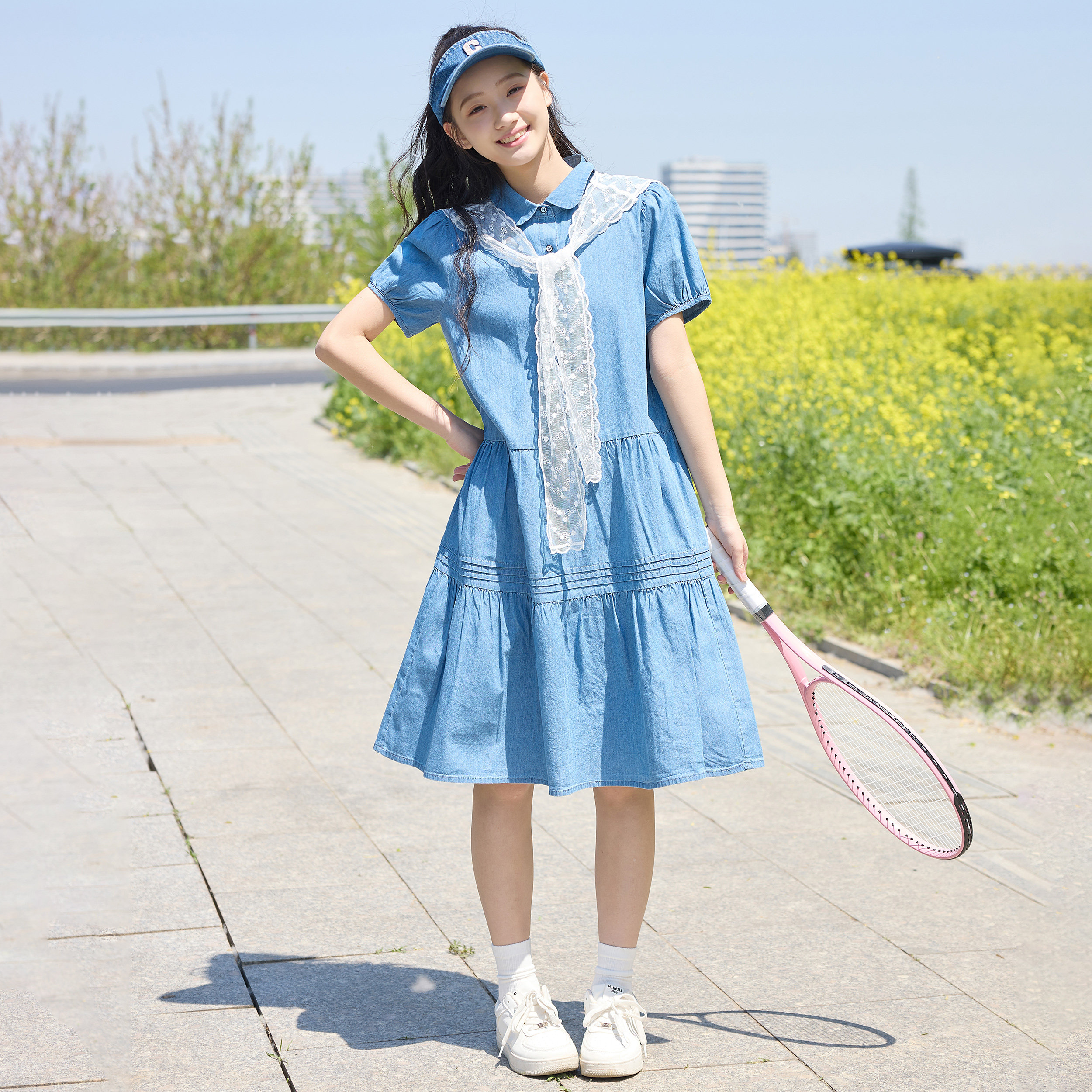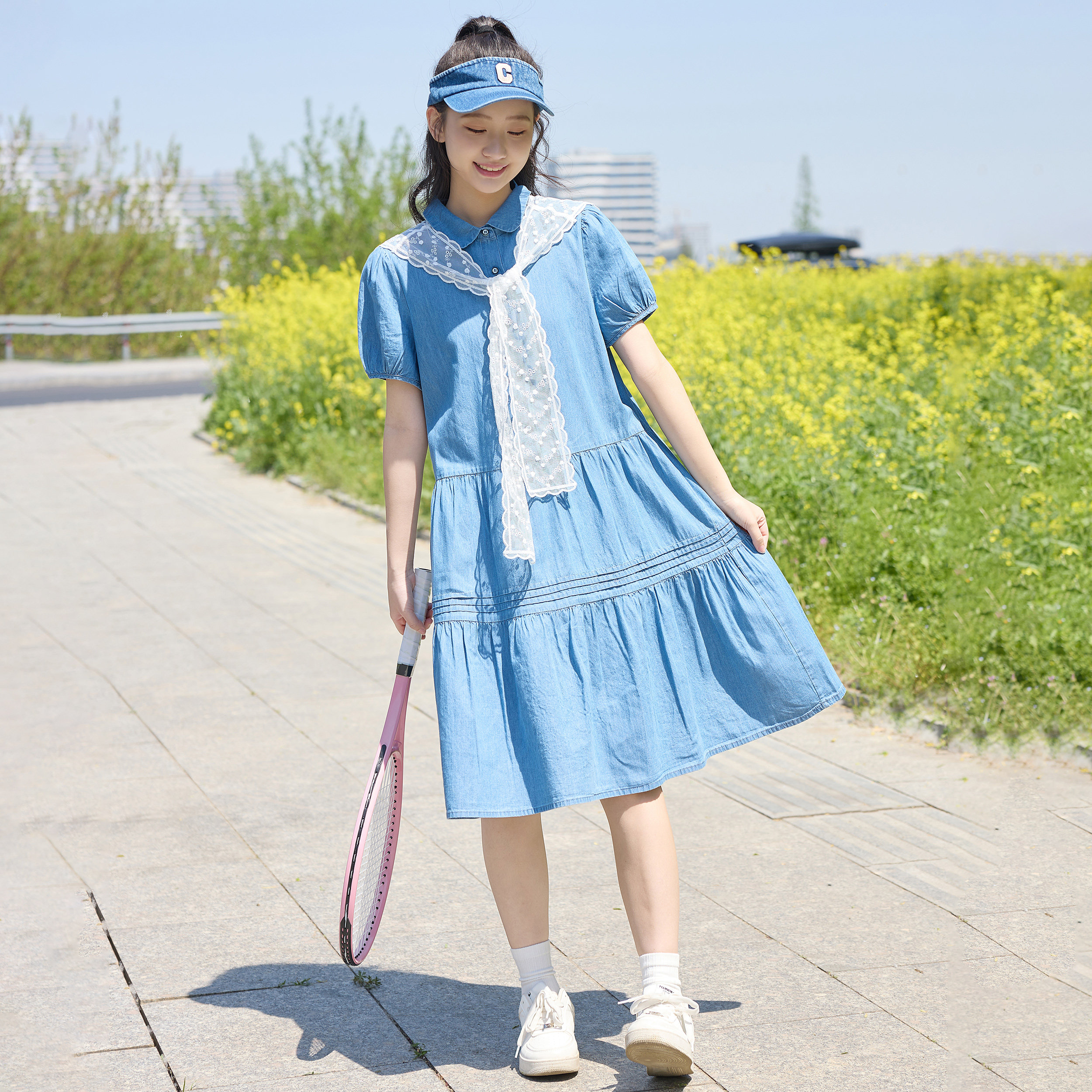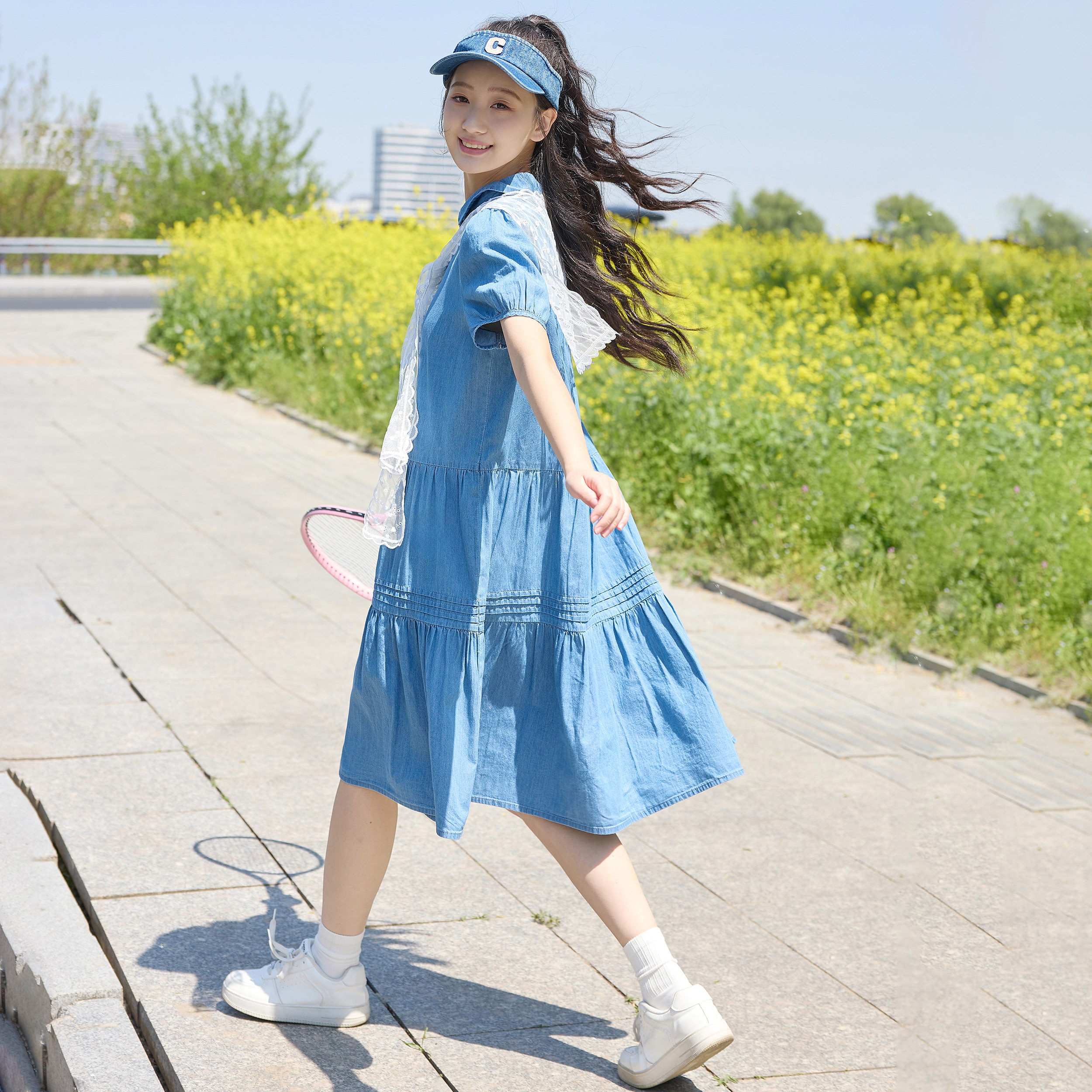 学院风初中生牛仔连衣裙女学生蕾丝领夏中长款收腰显瘦少女大摆裙