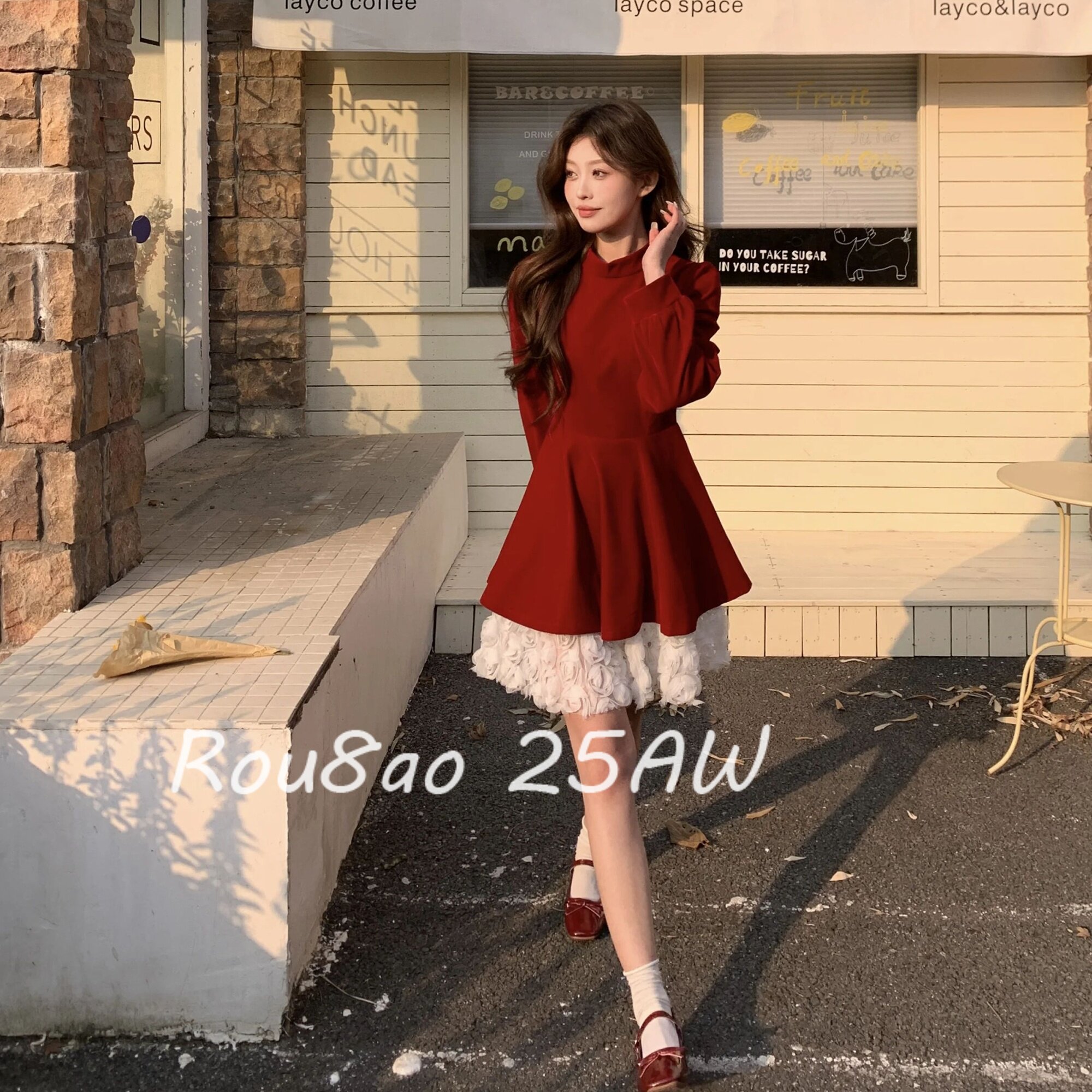 Rou8ao微胖大码女装玫瑰丝绒拼接连衣裙冬季收腰显瘦长短款A字裙