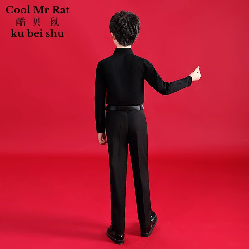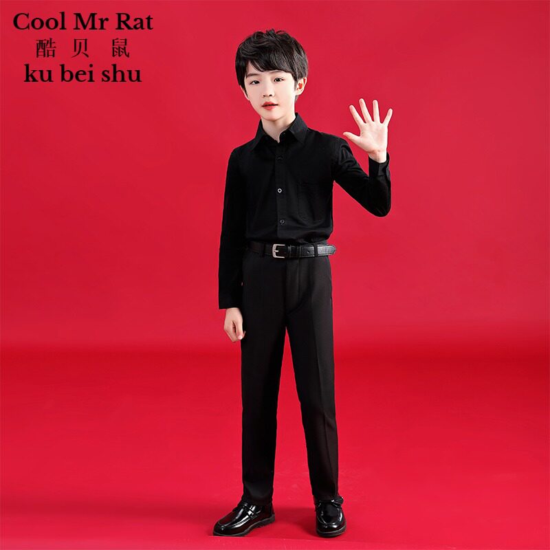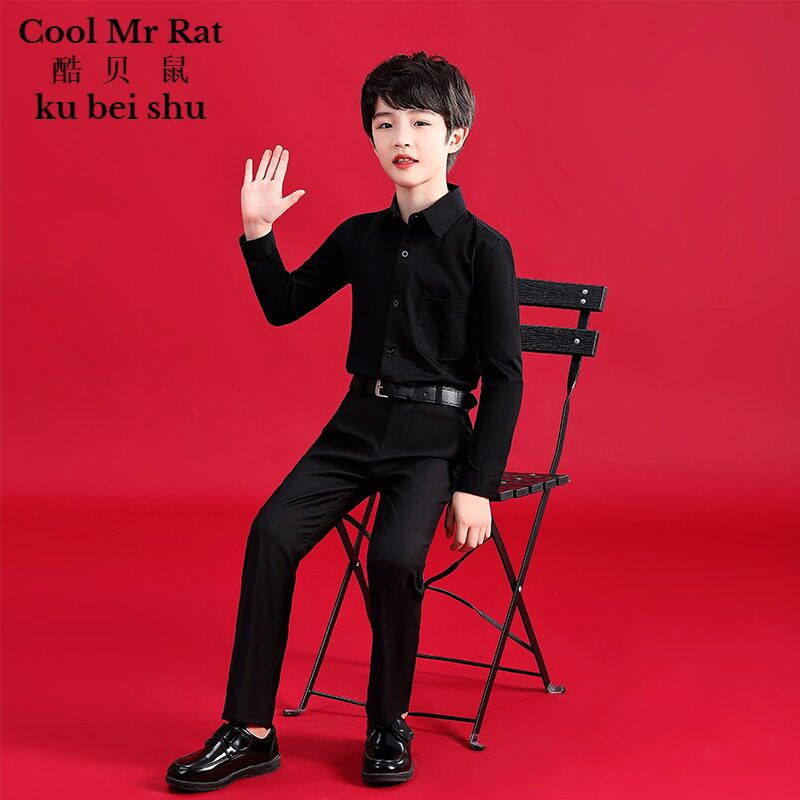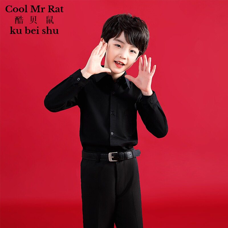儿童棉衬衫黑色男童衬衫夏学生中大童长袖洋气儿童白衬衣帅气短袖