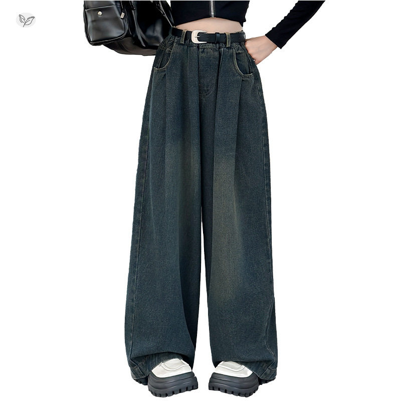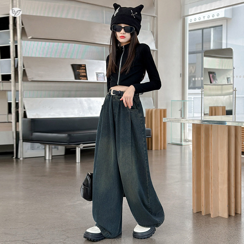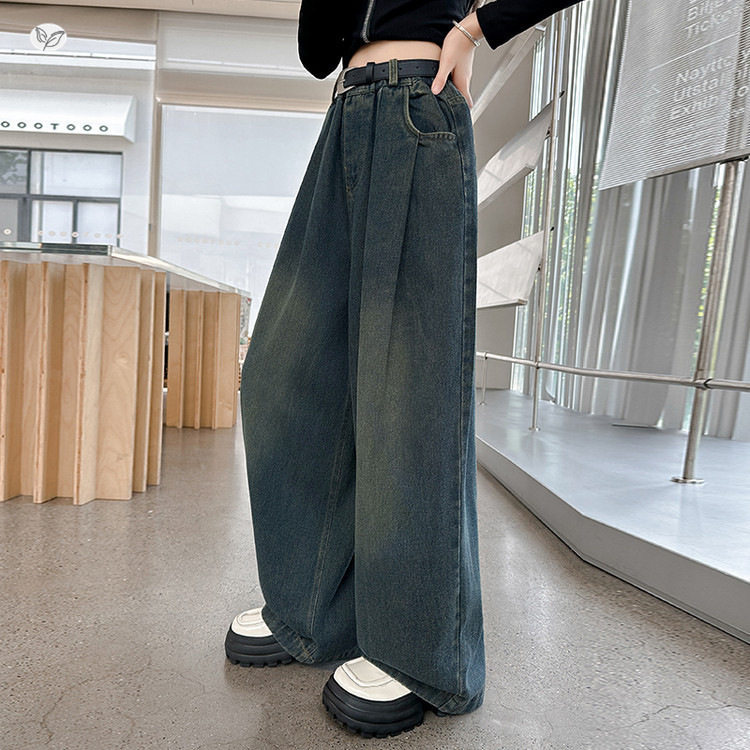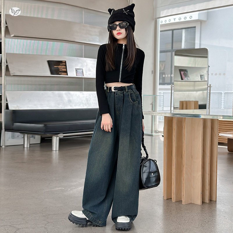 女童牛仔裤2026年新款春秋复古打褶阔腿裤中大童垂感拖地裤直筒裤