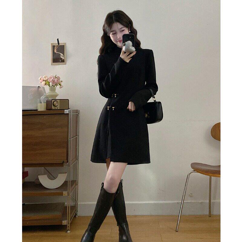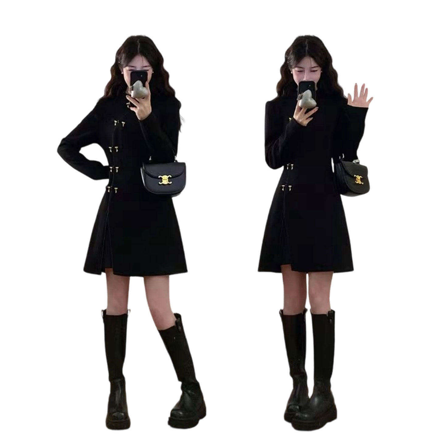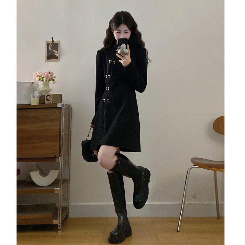 新中式国风黑色长袖连衣裙2026早春大码女装胖mm收腰遮胯短款裙子