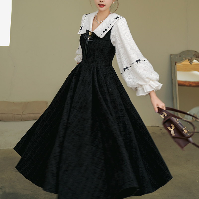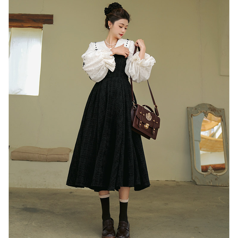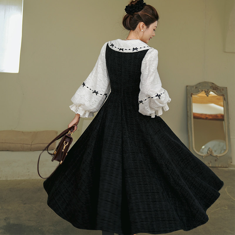 加厚重磅 弥爱原创《神秘诗社》法式复古呢料大摆连衣裙小黑裙冬