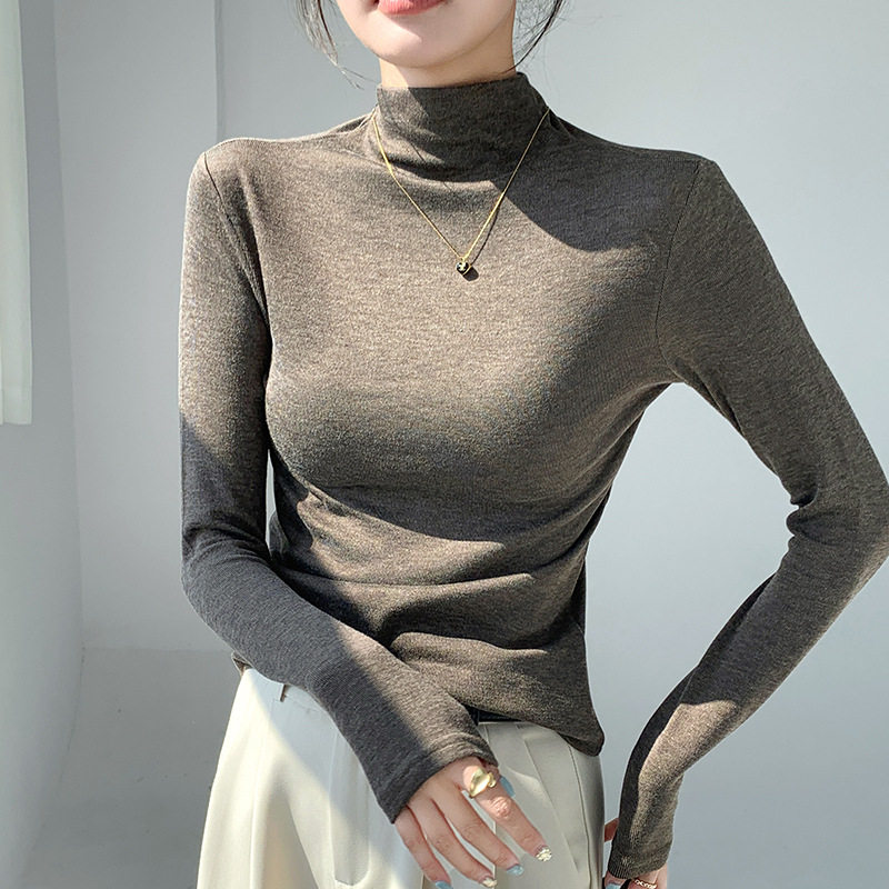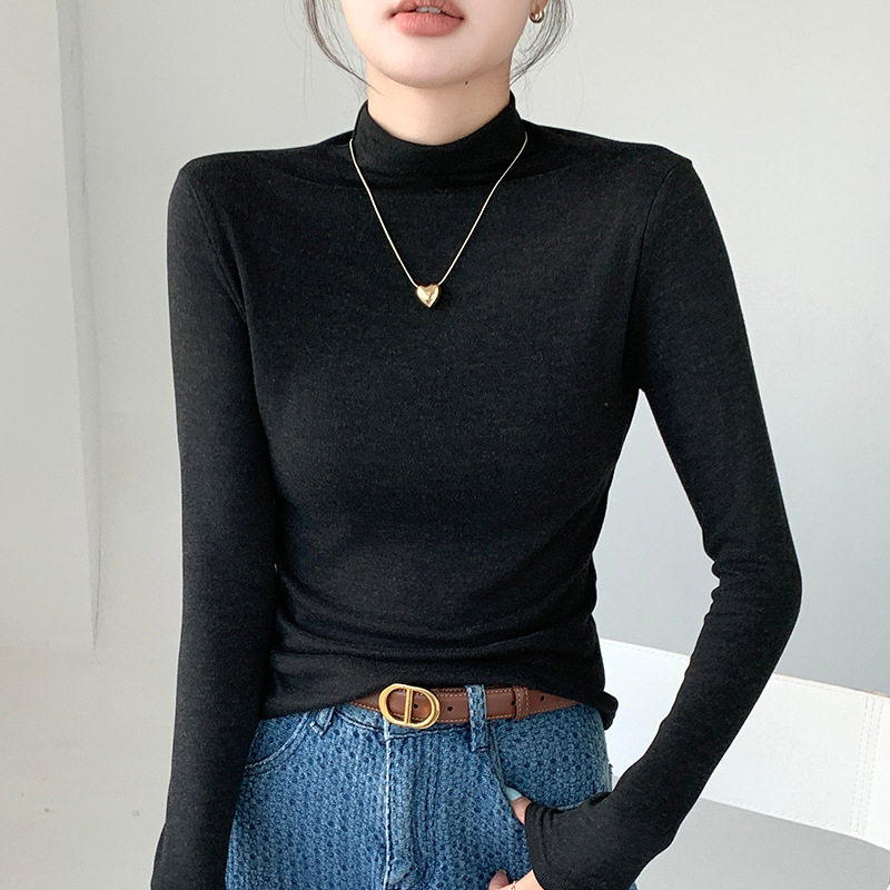 早春上衣女款2026新款米白色半高领打底衫修身显瘦内搭长袖上衣