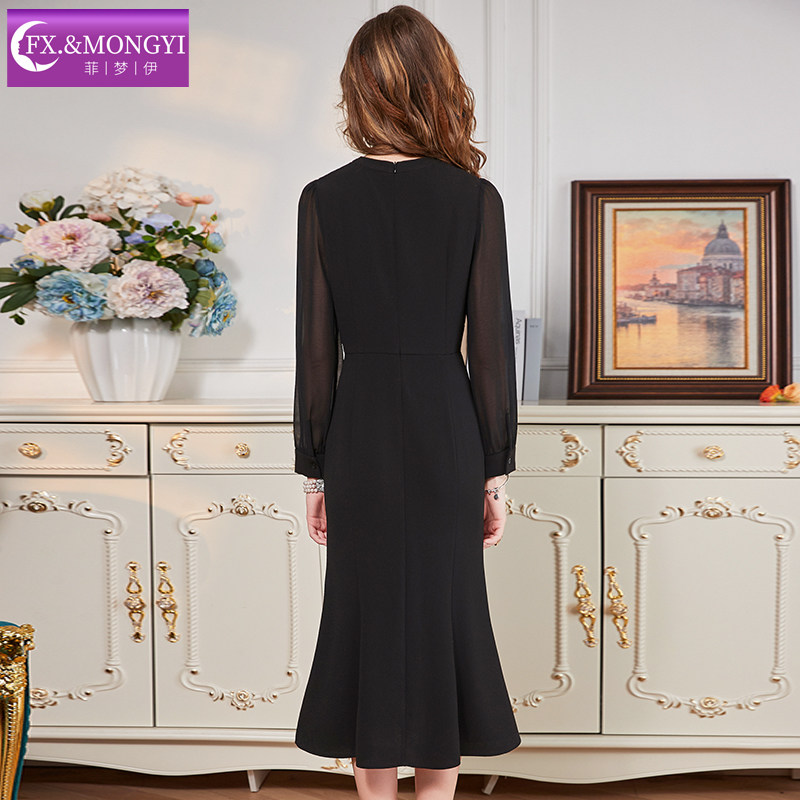 菲梦伊蕾丝边黑色连衣裙女长袖春装高端气质简约修身V领职业裙子