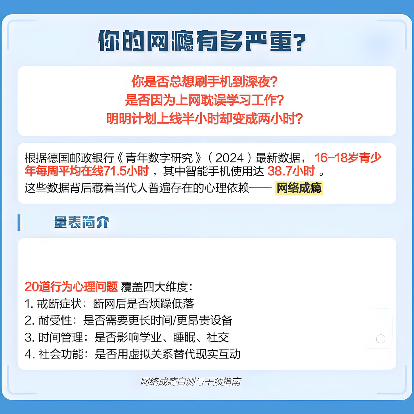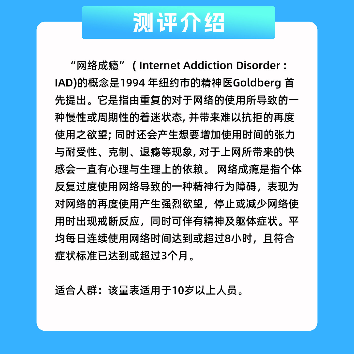 网络成瘾自测量表IAD适合成人青少年手机网瘾IAT心理测评自动报告