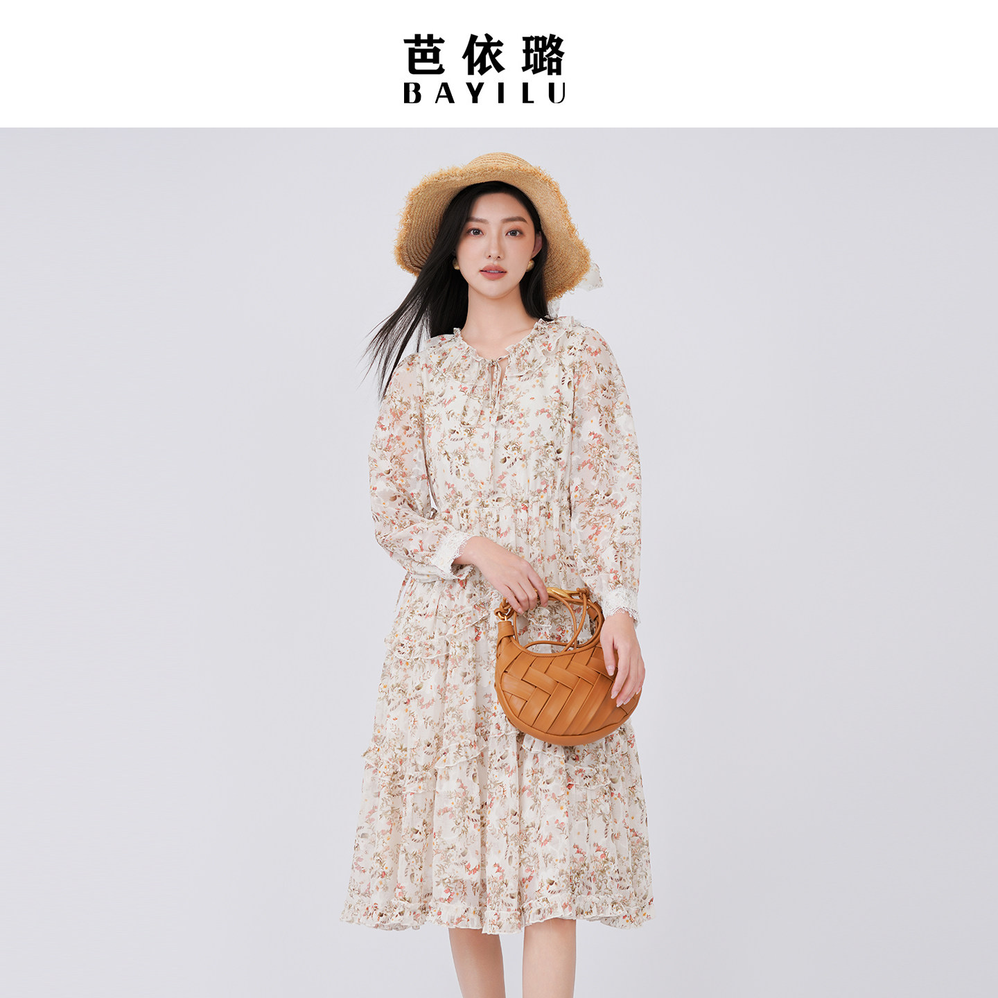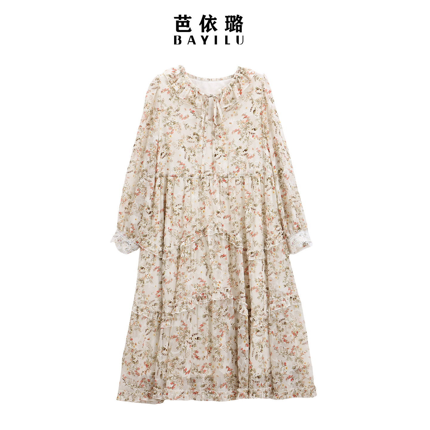 芭依璐2026春季新款碎花雪纺连衣裙长袖收腰气质法式韩版荷叶边女