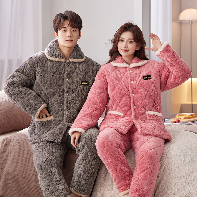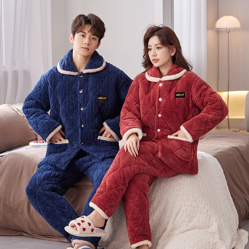 睡衣女士冬季加厚加绒三层夹棉袄保暖套装法兰绒大码可外穿家居服