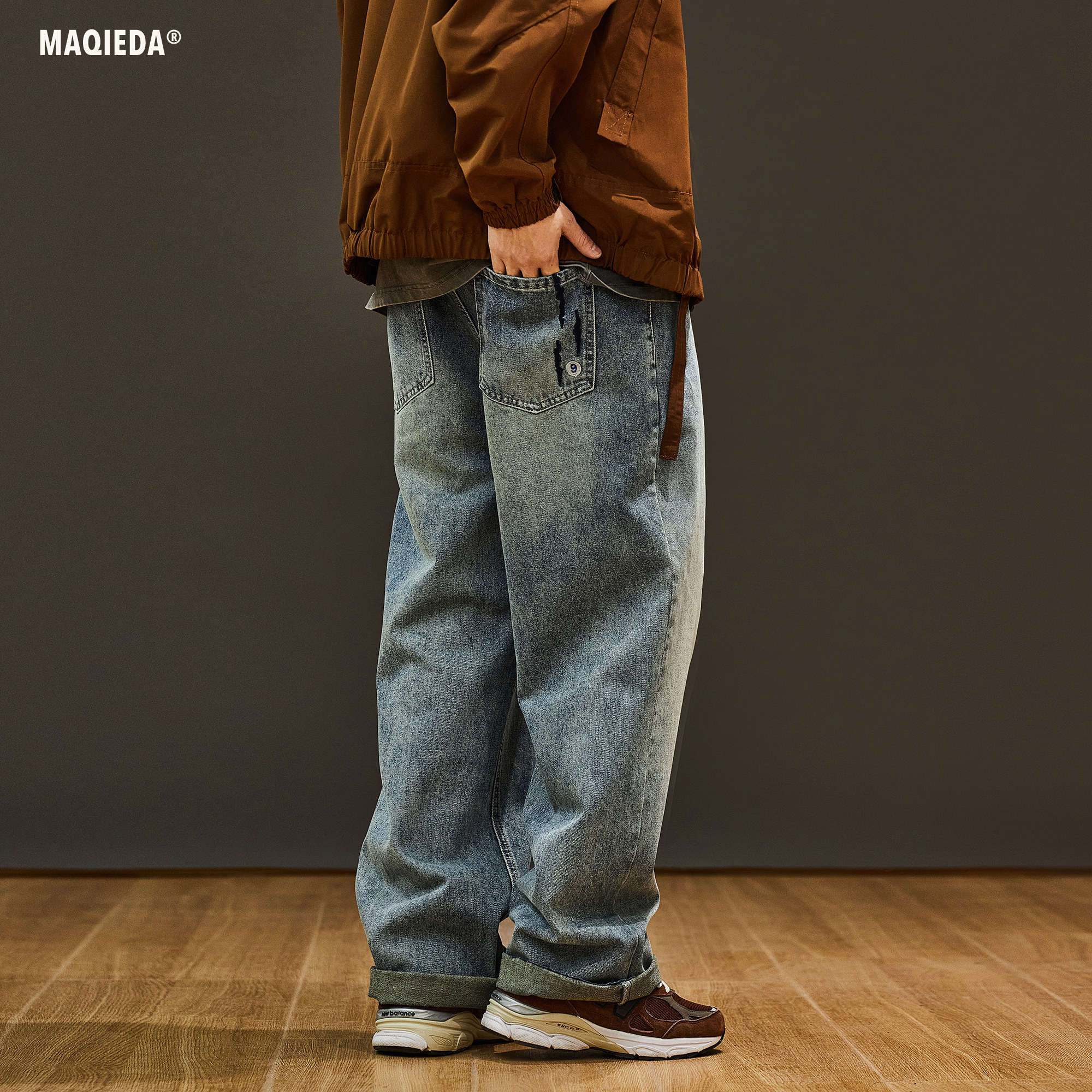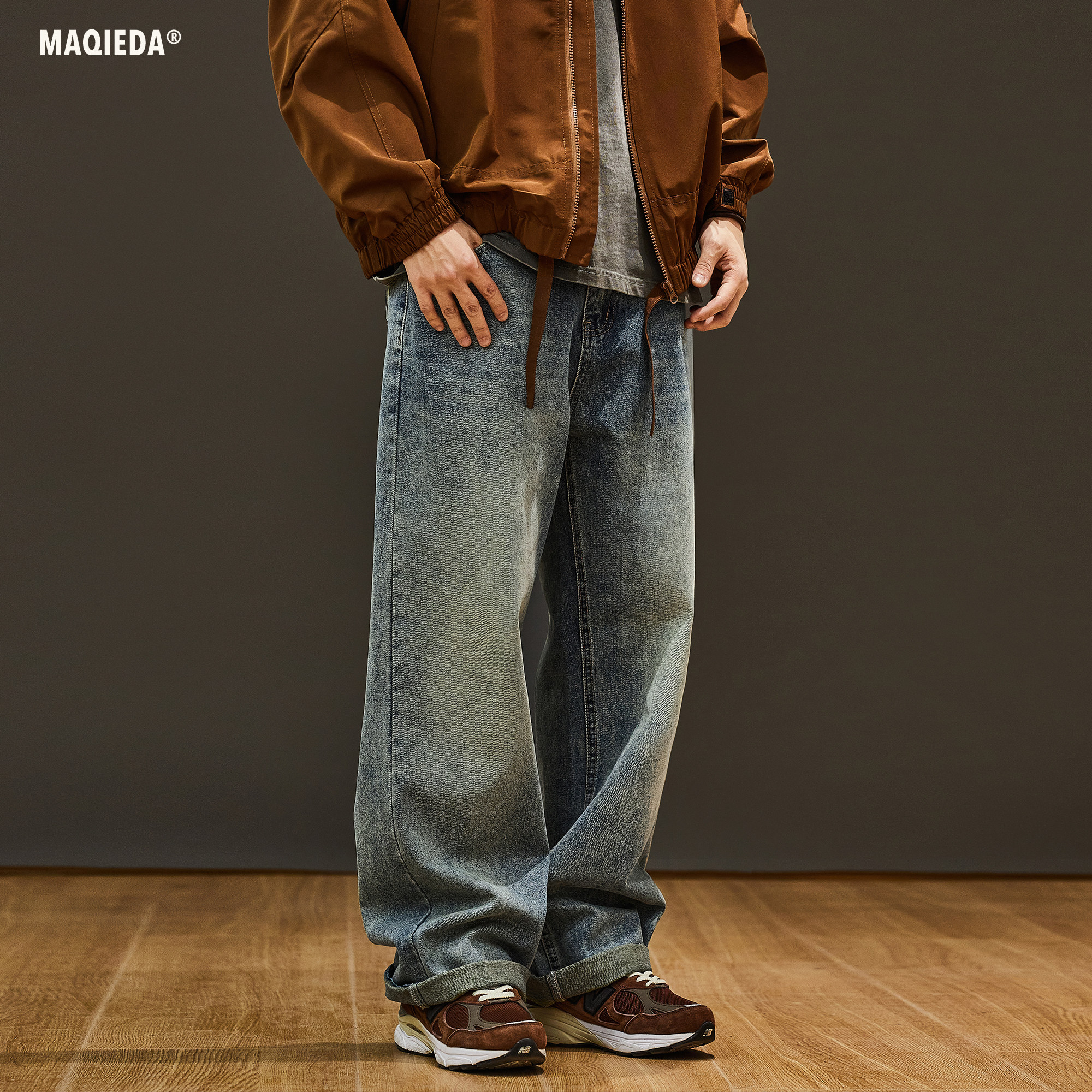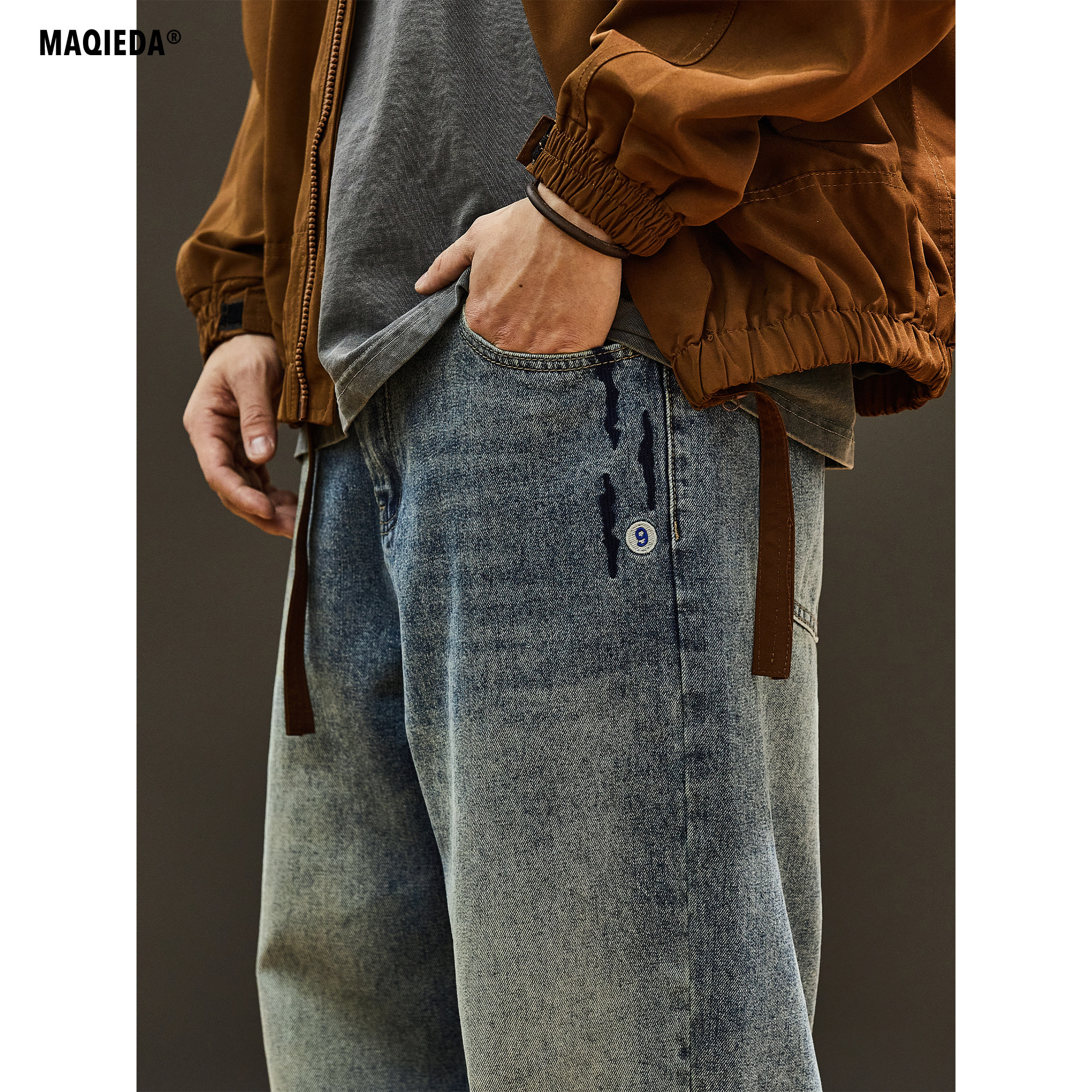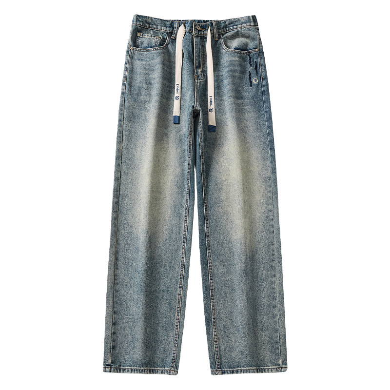 马切达春季男款抽绳美式经典款牛仔长裤直筒潮牌百搭宽松休闲裤