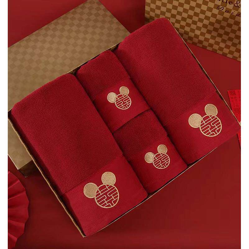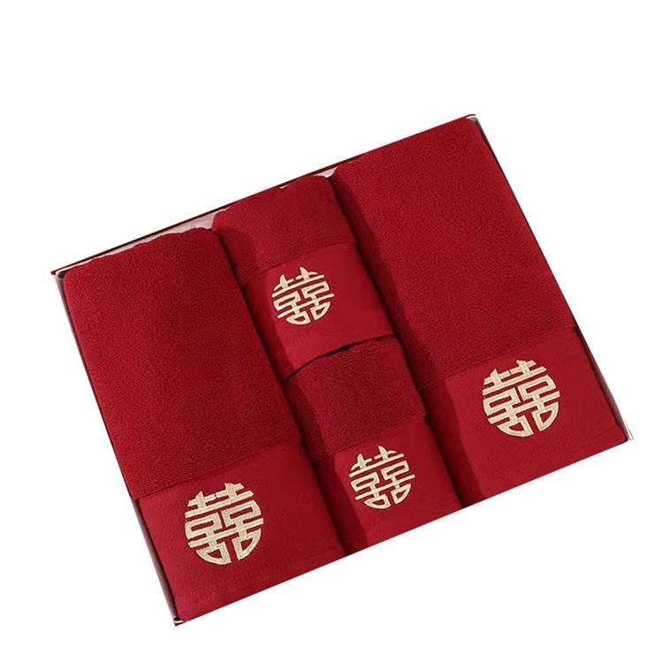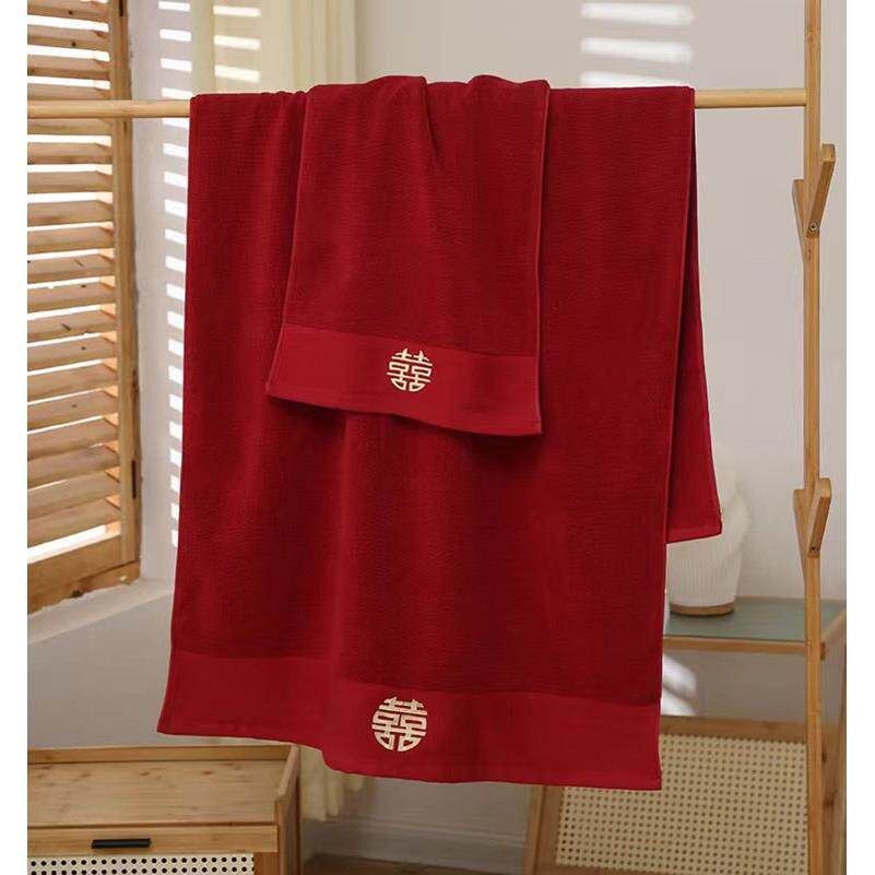 日本muI结婚毛巾浴巾陪嫁一对红色四件套全纯棉喜字面巾婚庆用品
