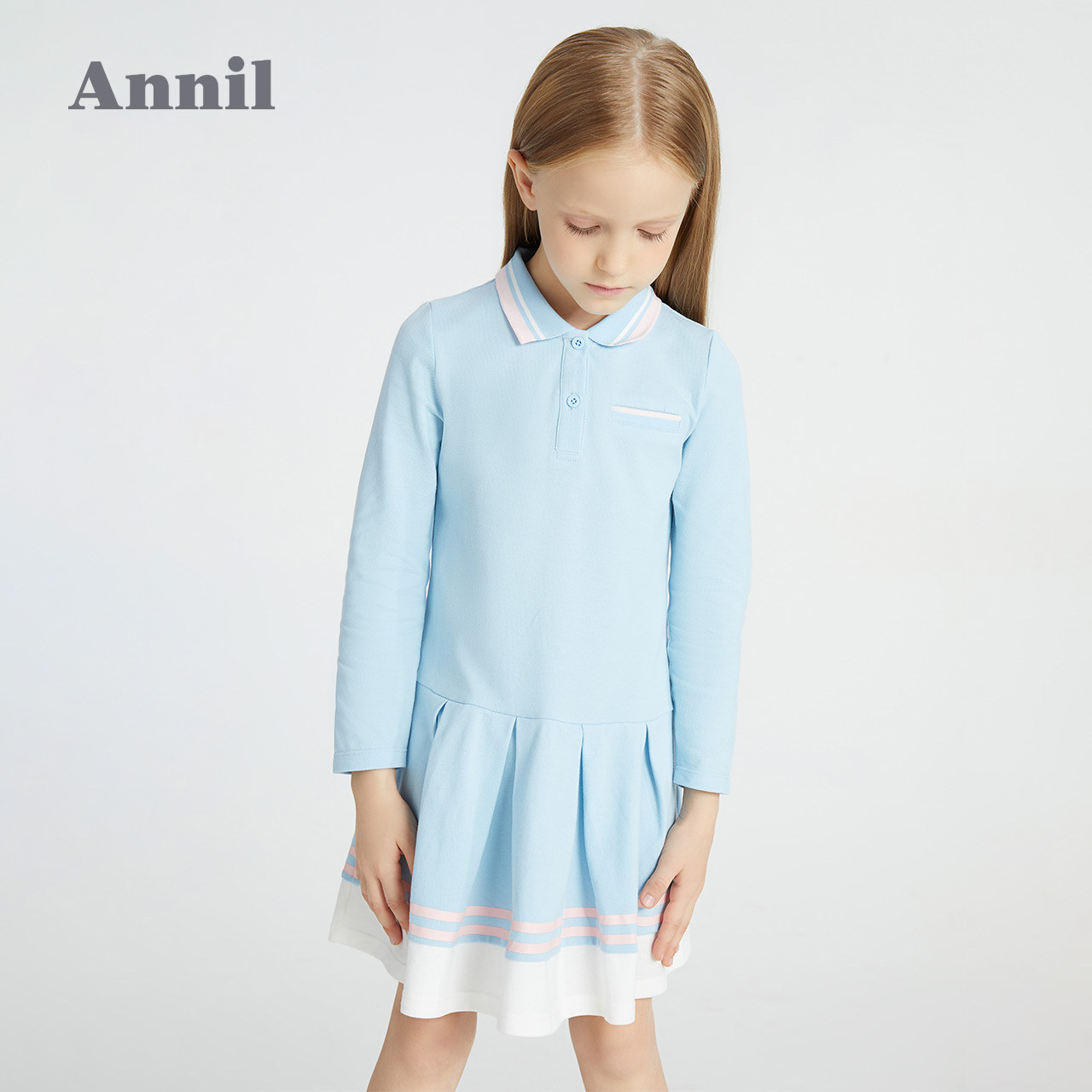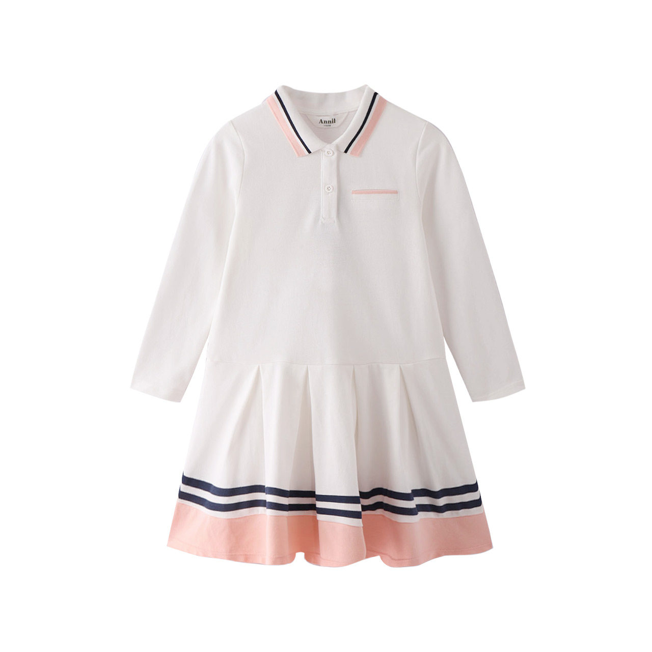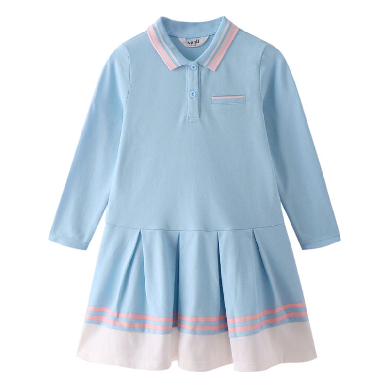 安奈儿女童纯棉长袖连衣裙春季新款纯色拼接款学生运动裙子