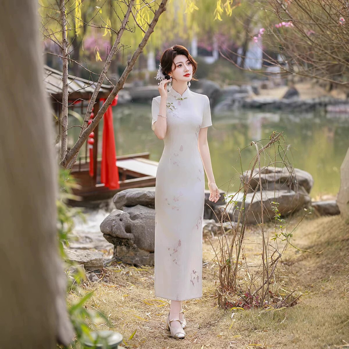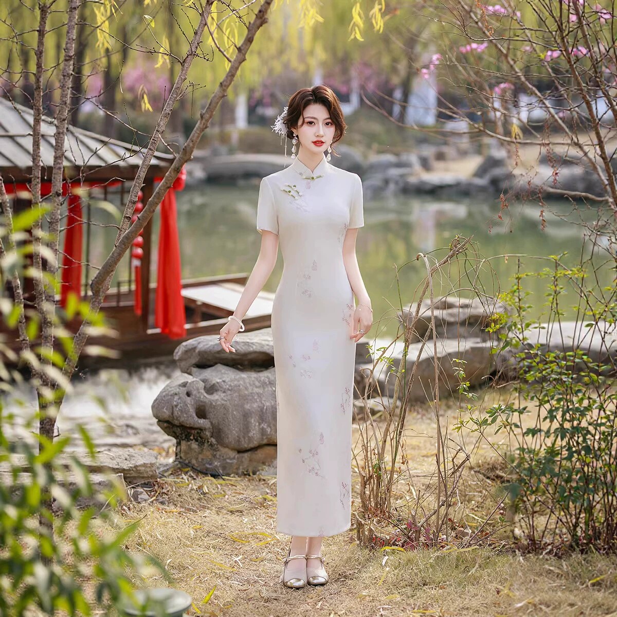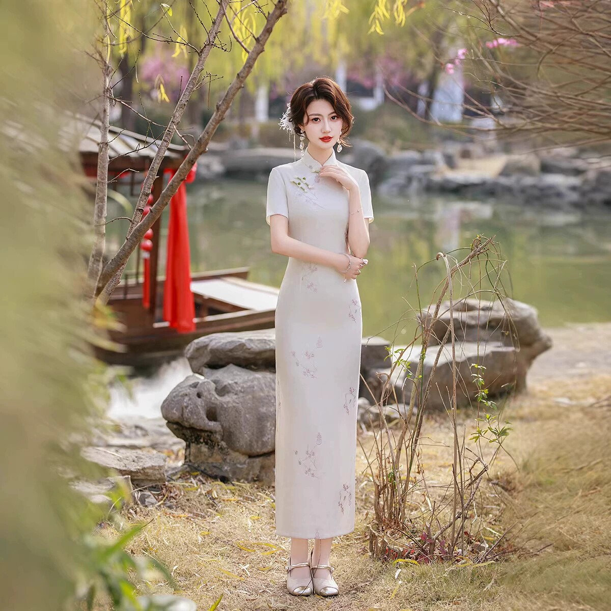 新中式复古风改良旗袍女短袖长裙日常刺绣修身显瘦高级感连衣裙夏