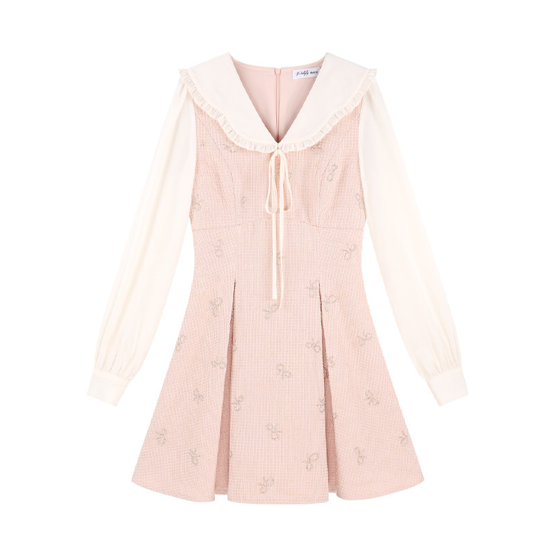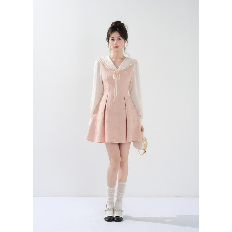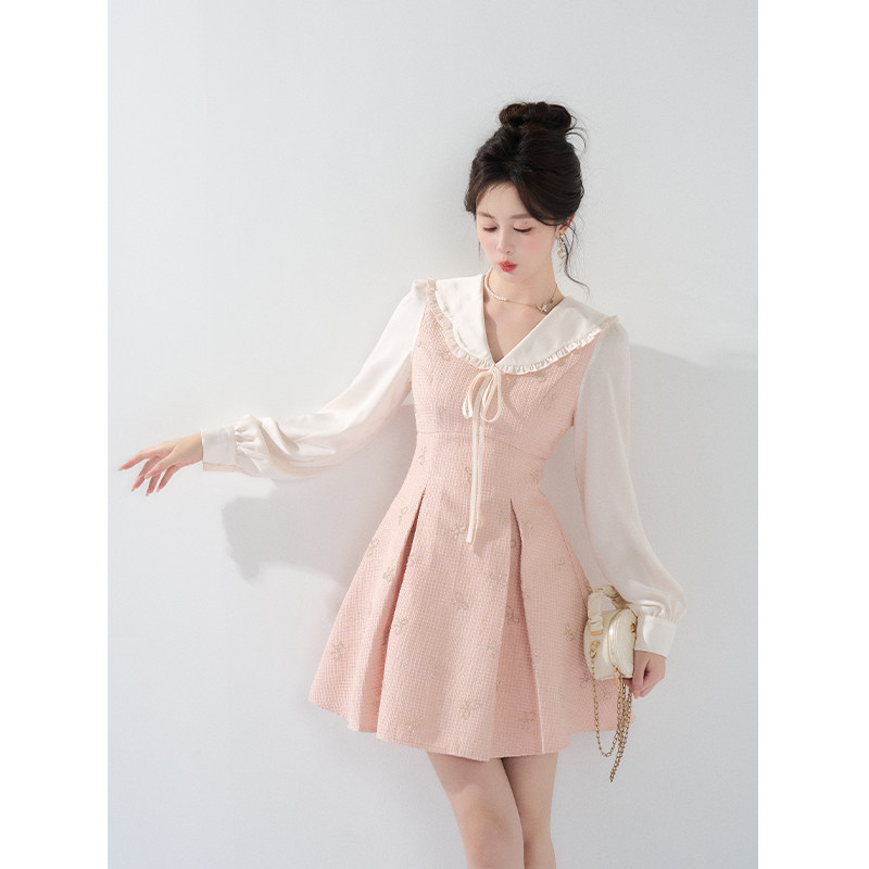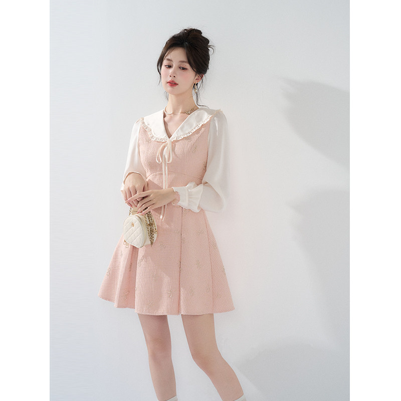 法式小香风粉色甜美v领连衣裙女长袖秋季掐腰显瘦初恋小洋裙a子裙