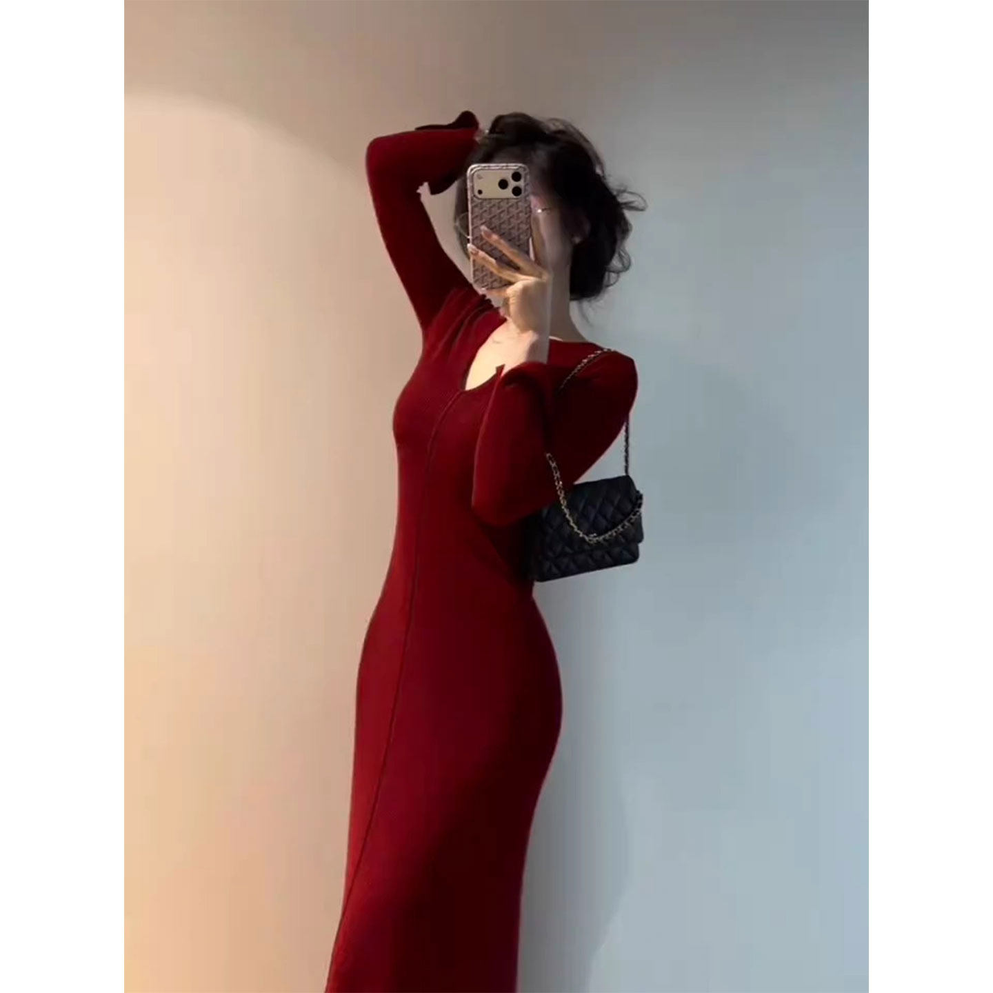 出席重要场合的红色针织连衣裙女秋冬季配大衣内搭收腰包臀长裙子