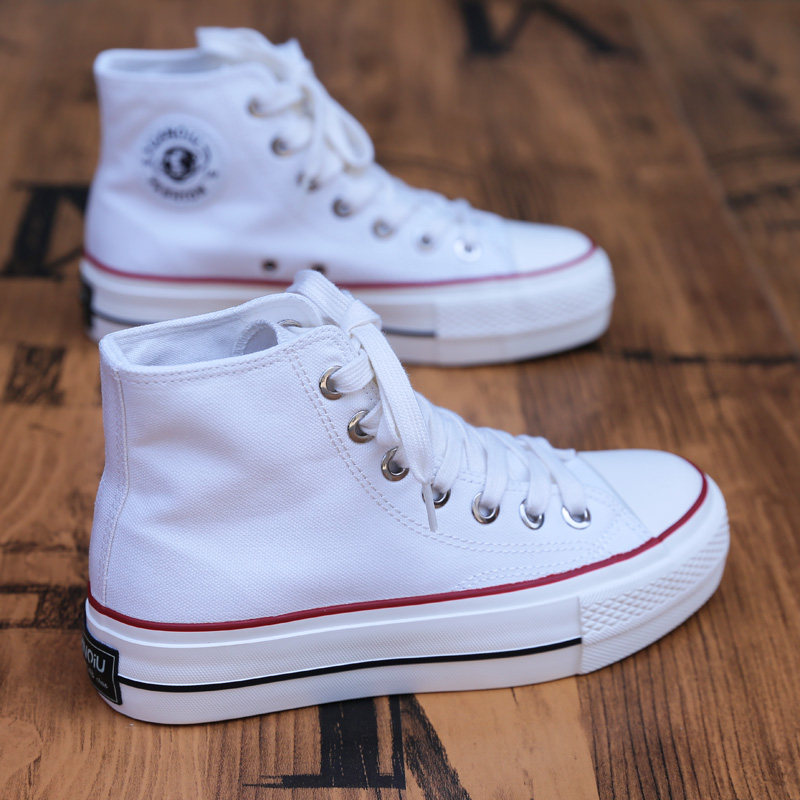 环球女鞋白色帆布鞋高帮女款休闲鞋子百搭厚底球鞋小白鞋增高板鞋
