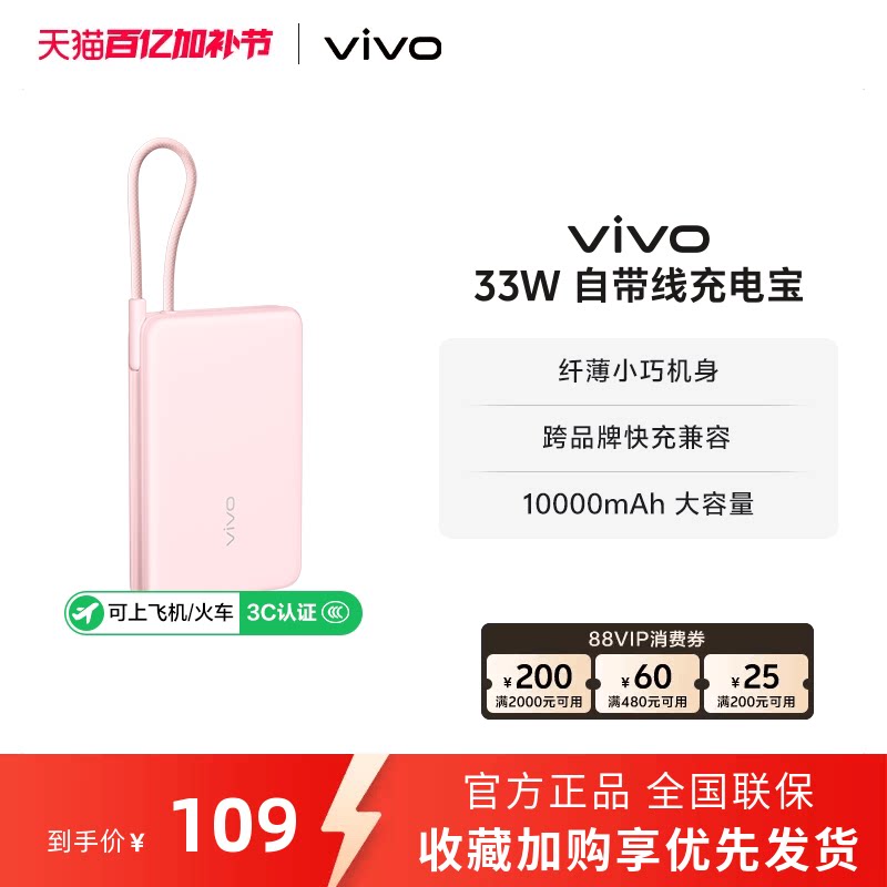 【 3C认证】vivo自带线充电宝10000毫安33W可上飞机大容量快充便携学生新品户外出行