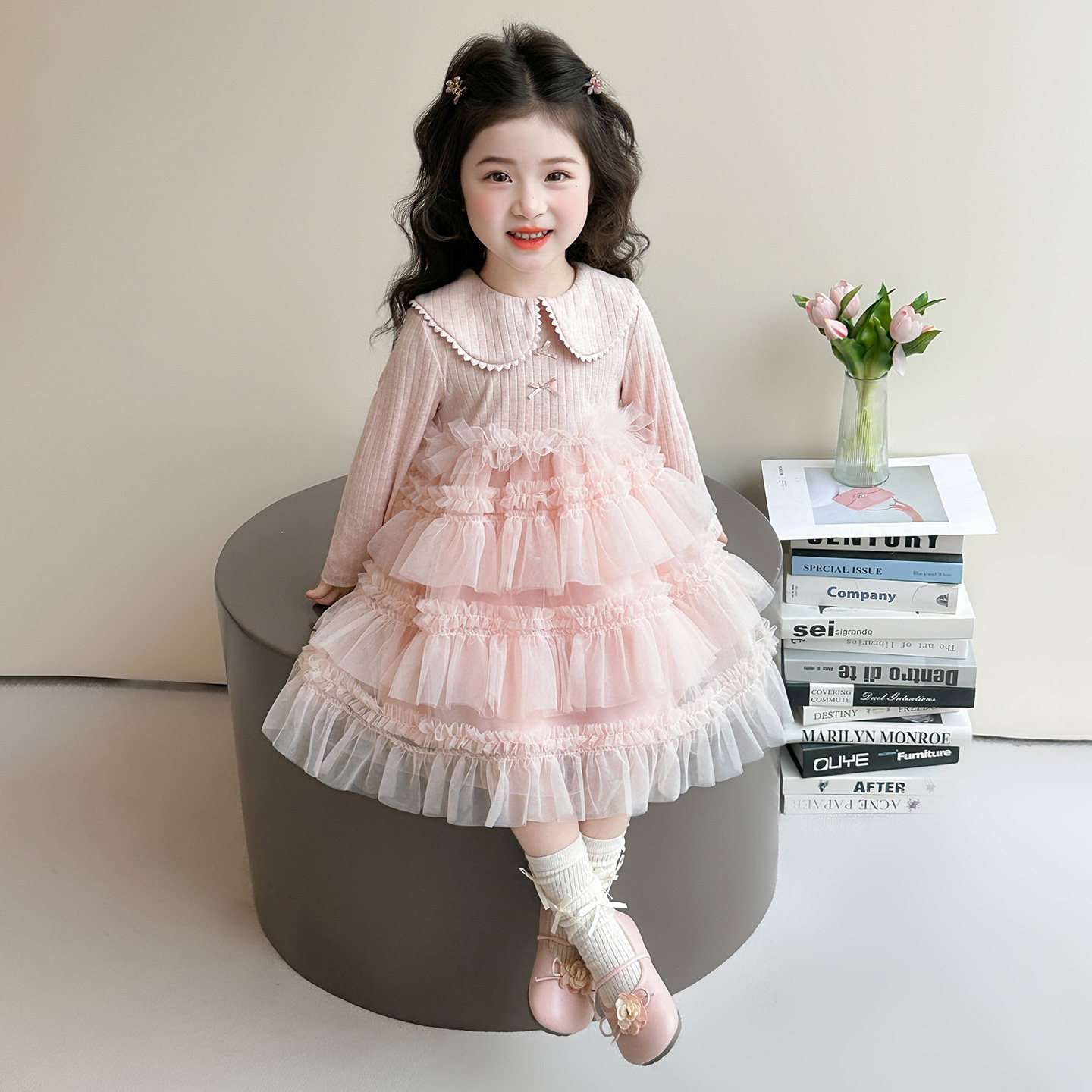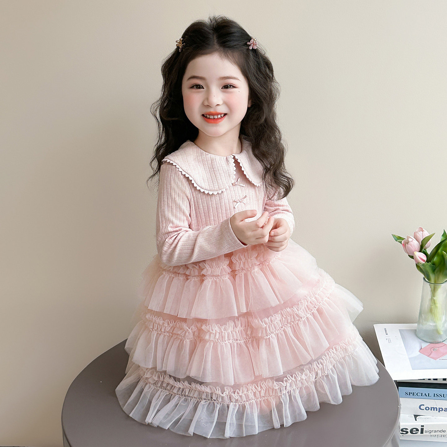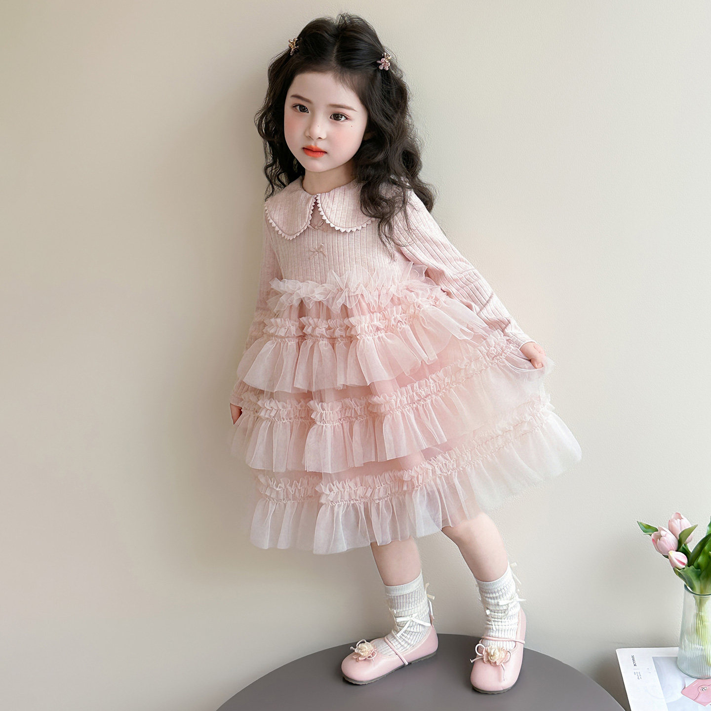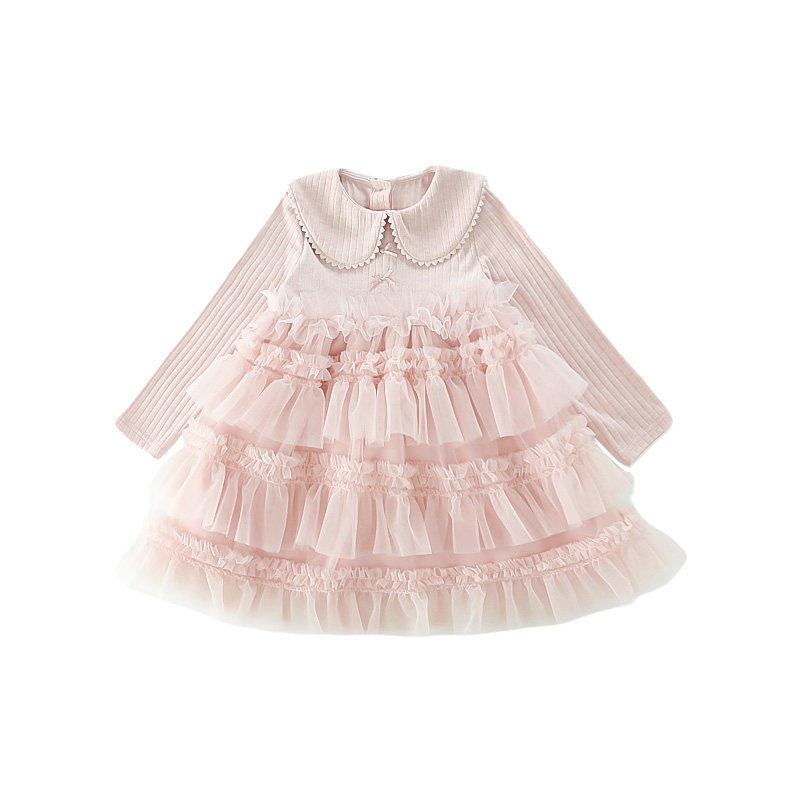 女童连衣裙春季2026新款儿童洋气爱心花边娃娃领纱裙女宝宝公主裙