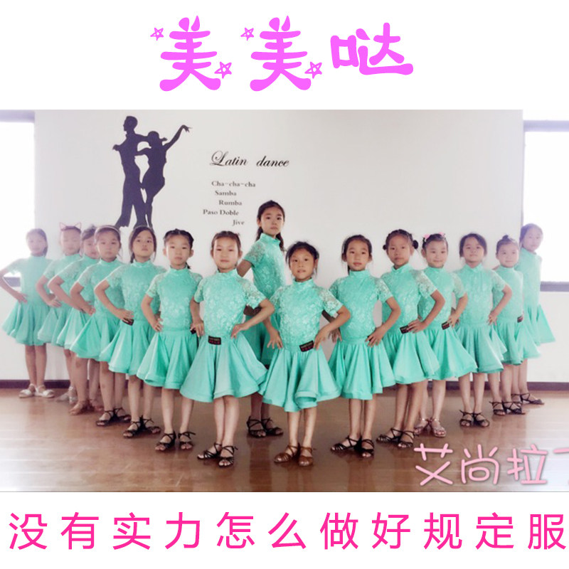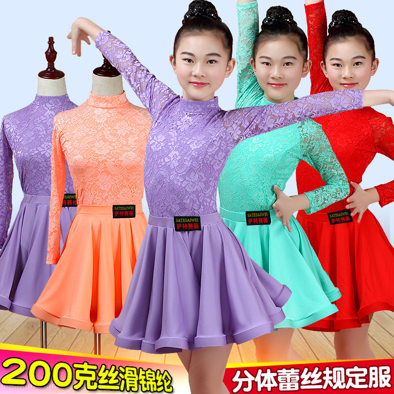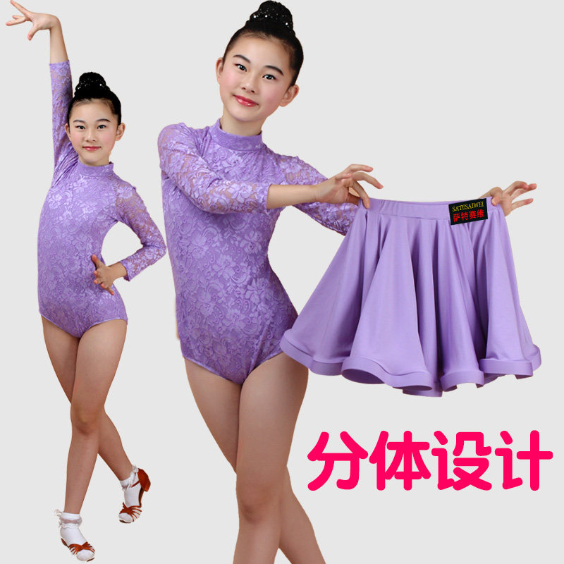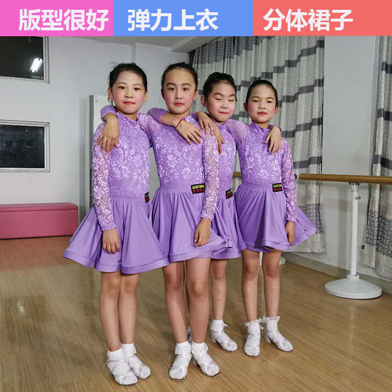 儿童女拉丁舞裙女童大童紫色连体训练春夏季新款蕾丝短袖比赛服