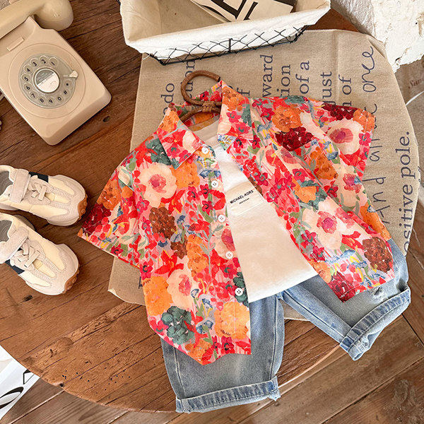 2026夏季儿童花衬衫男童小童休闲纯棉上衣网红宝宝沙滩风衬衣短袖