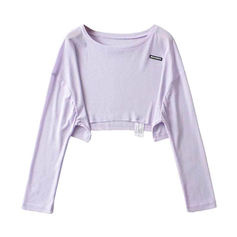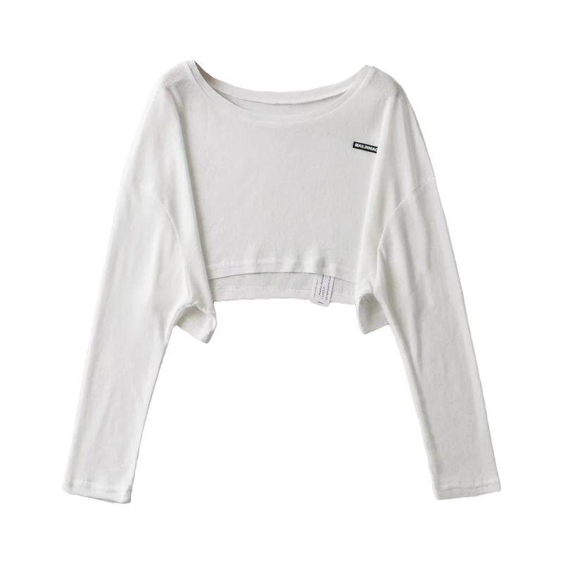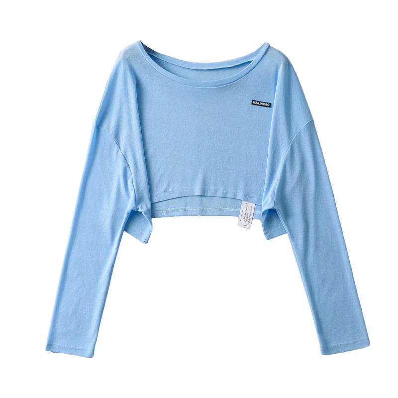 荧光绿色宽松短款落肩长袖t恤女夏薄款微透圆领贴标上衣防晒罩衫