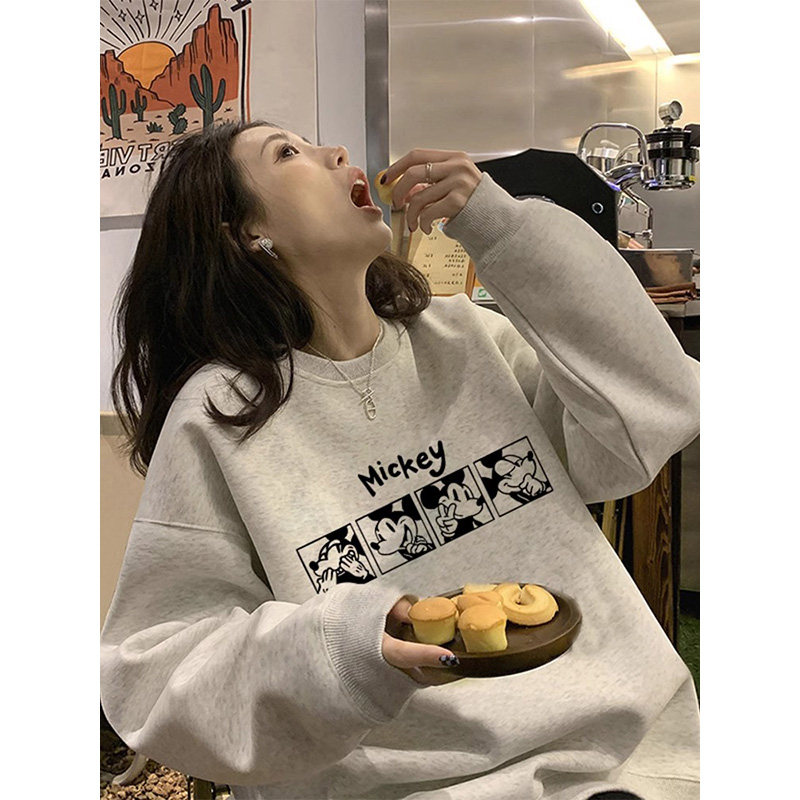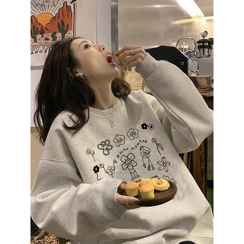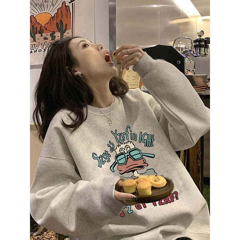 卡通小猫灰色圆领卫衣女款秋冬潮牌2026新款爆款上衣加绒加厚外套