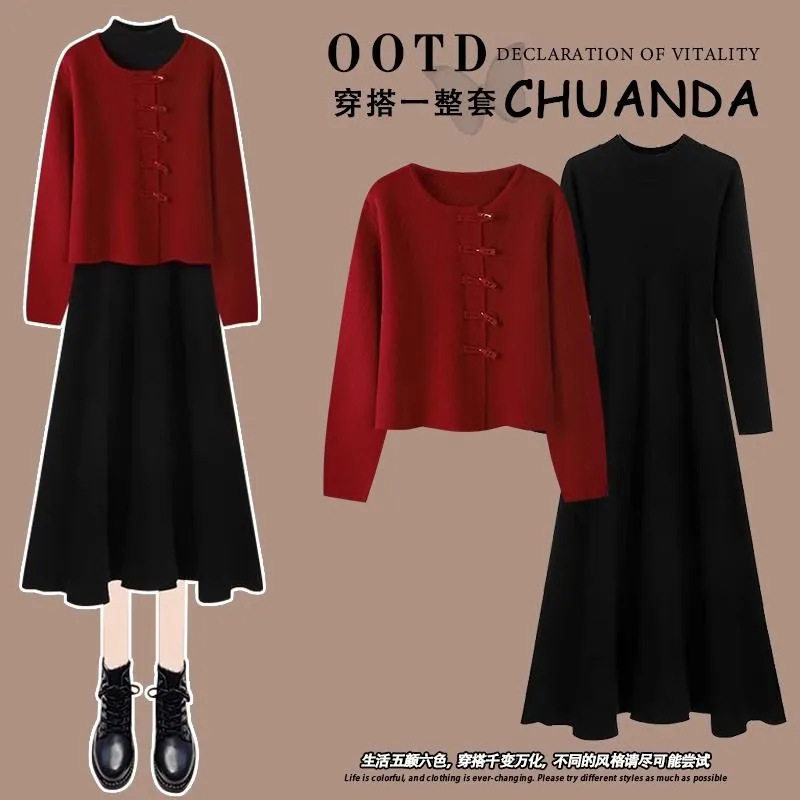 慵懒短款宽松牛角扣红色毛衣外套女2023秋冬收腰针织连衣裙两件套