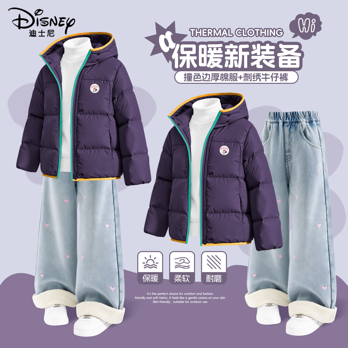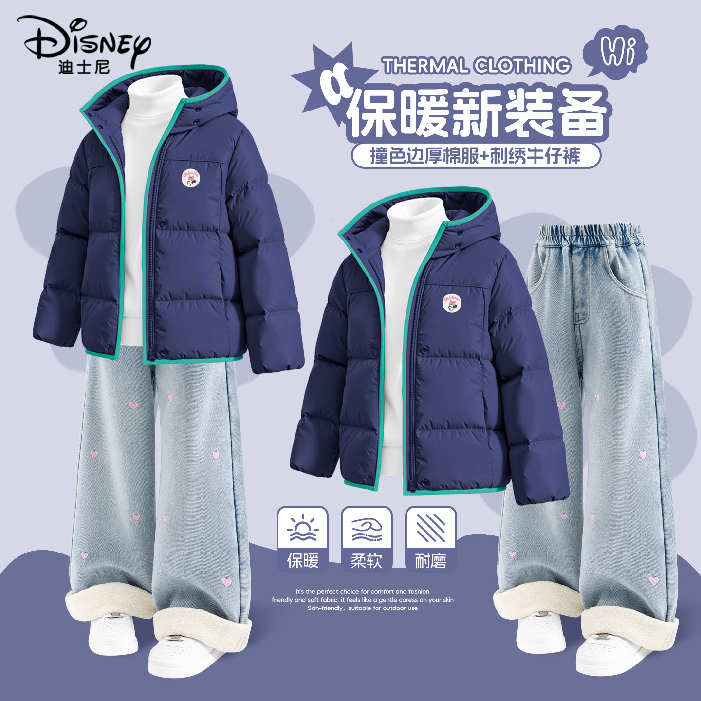 迪士尼女童加厚棉服套装保暖2026新款儿童冬装加绒牛仔裤两件套女
