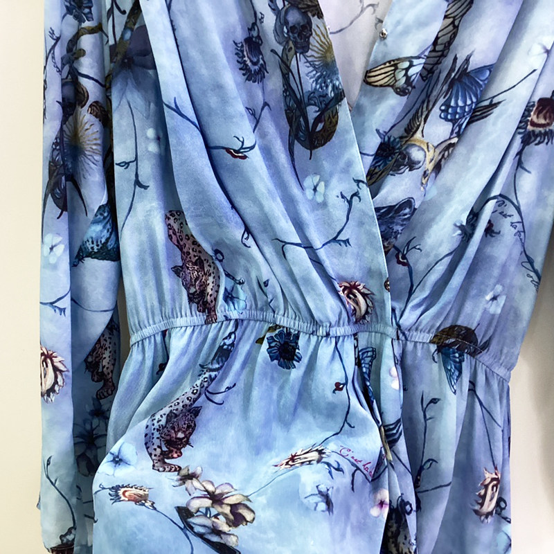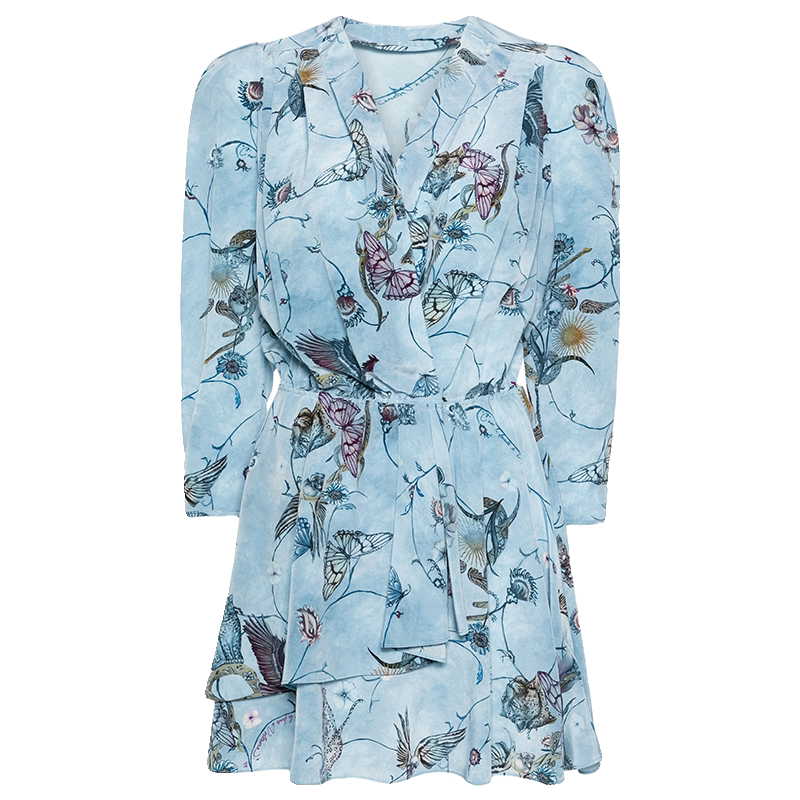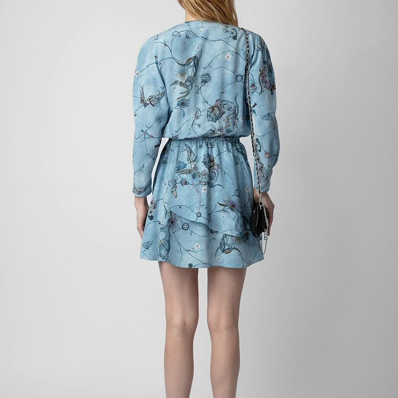 24春夏新款ZV蓝色真丝连衣裙女短款长袖V领花鸟图案唯美优雅法式