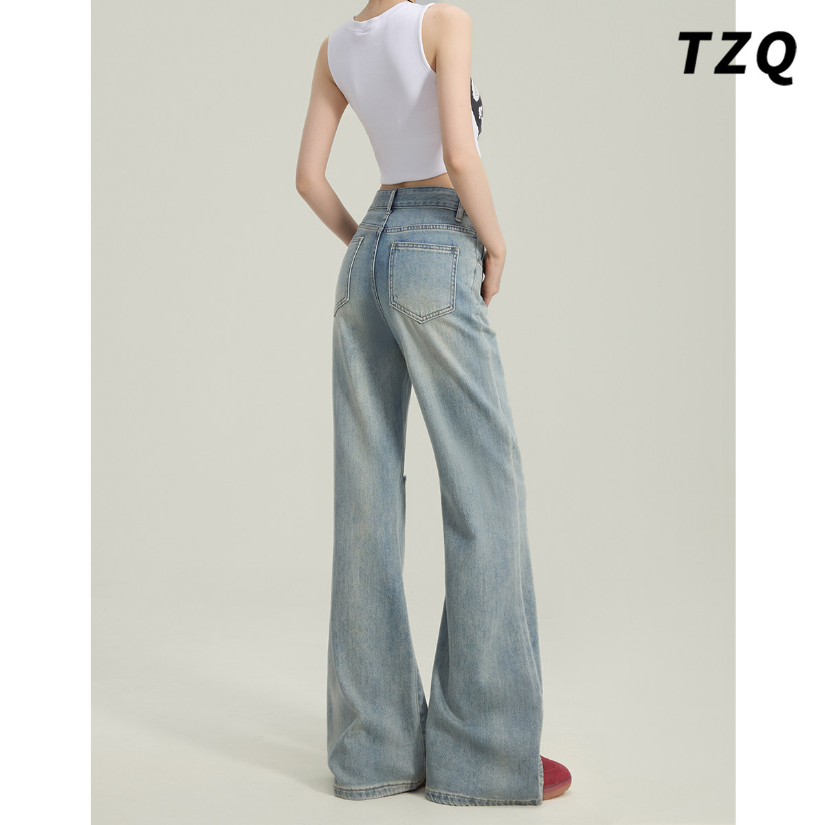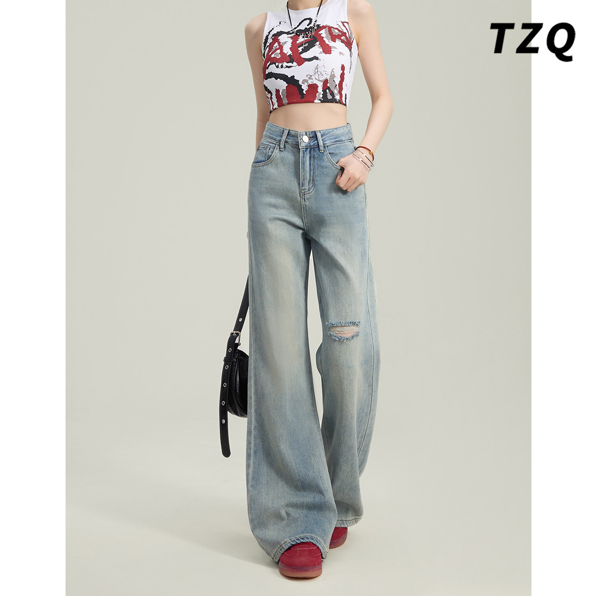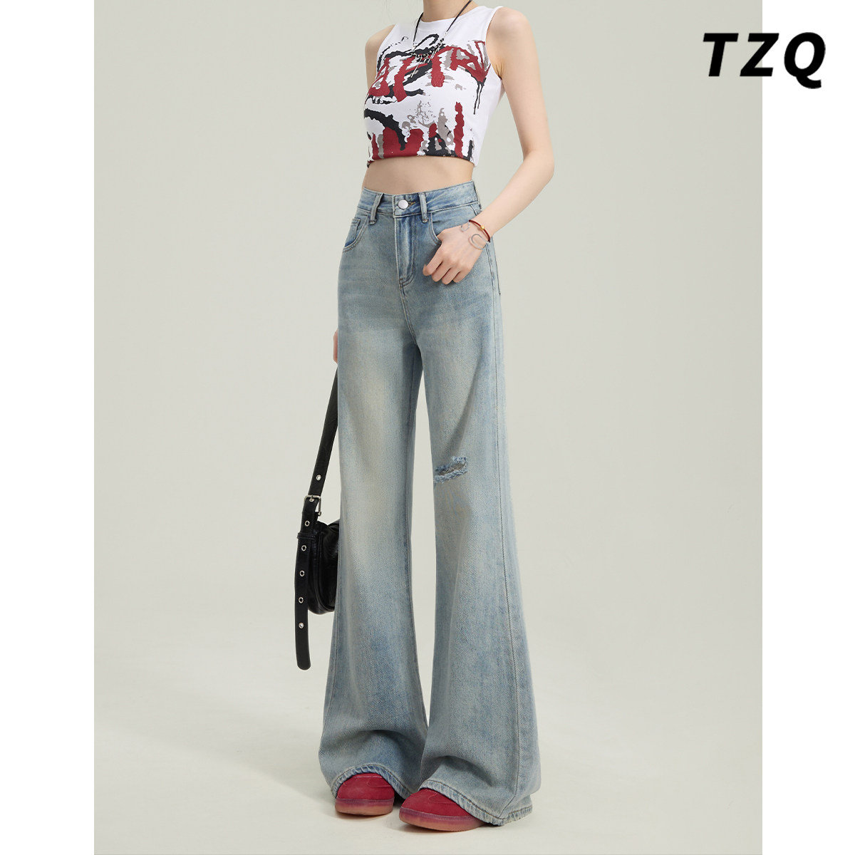 美式复古破洞微喇牛仔裤女款夏季不贴腿高腰修身显瘦阔腿喇叭裤子