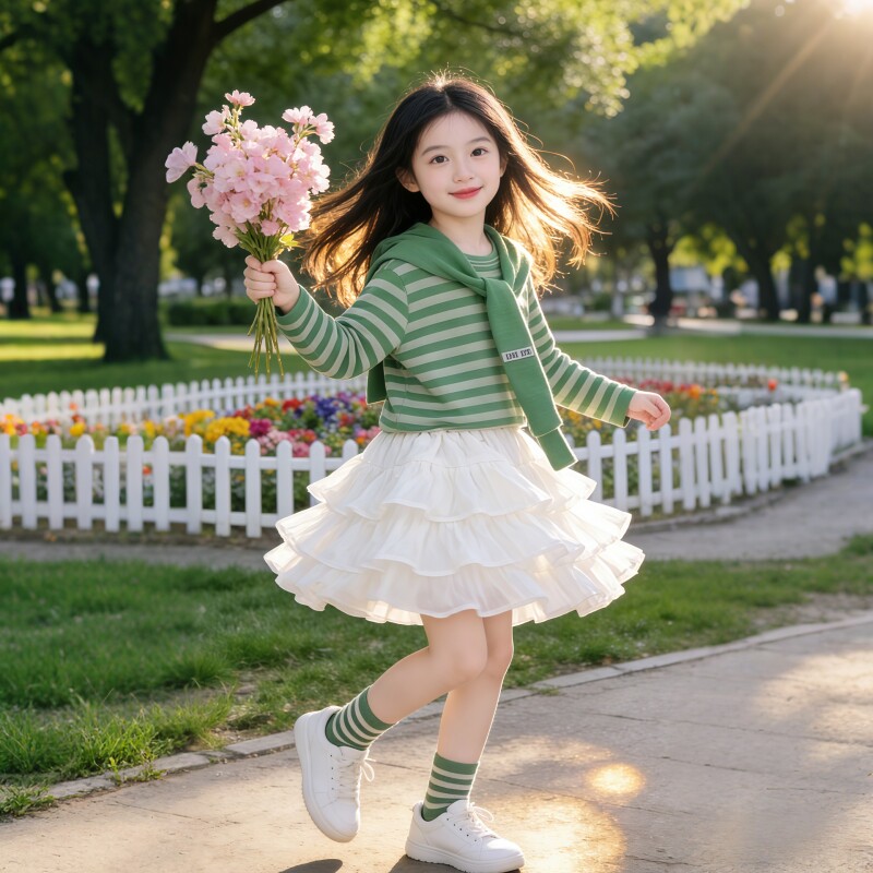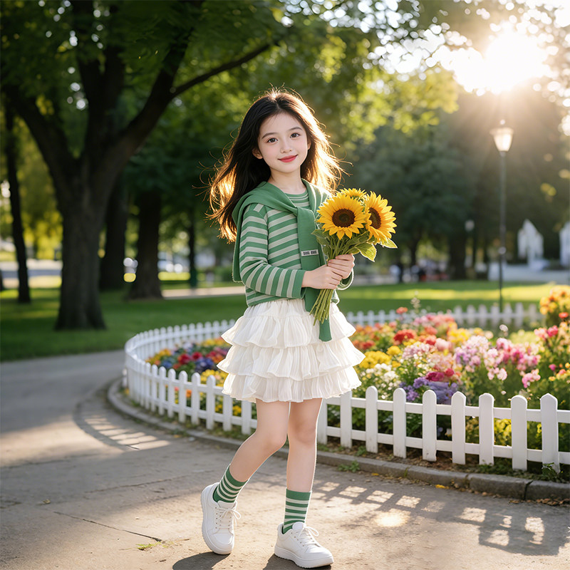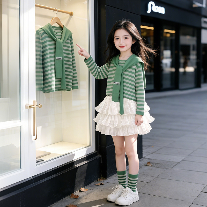 女童套装2026年新款春秋装中大童洋气韩版假俩件条纹上衣半裙套装
