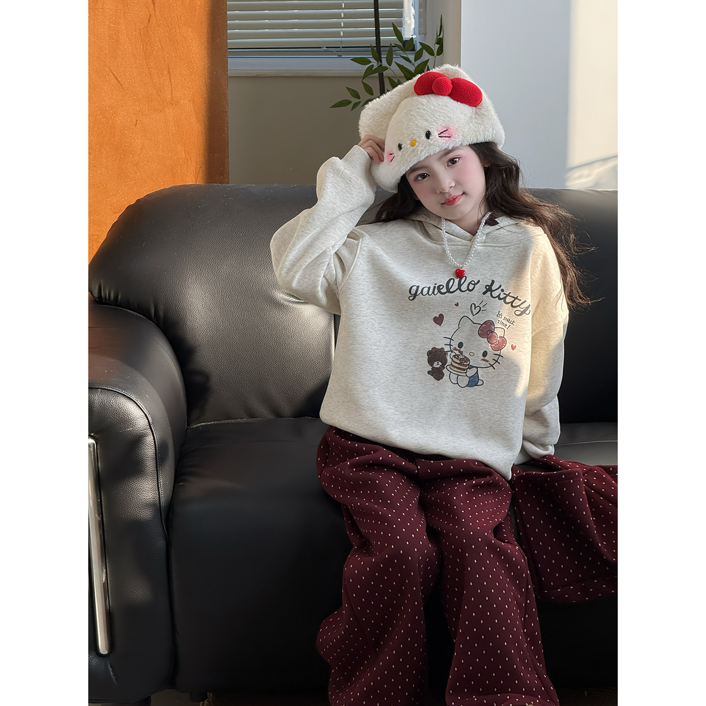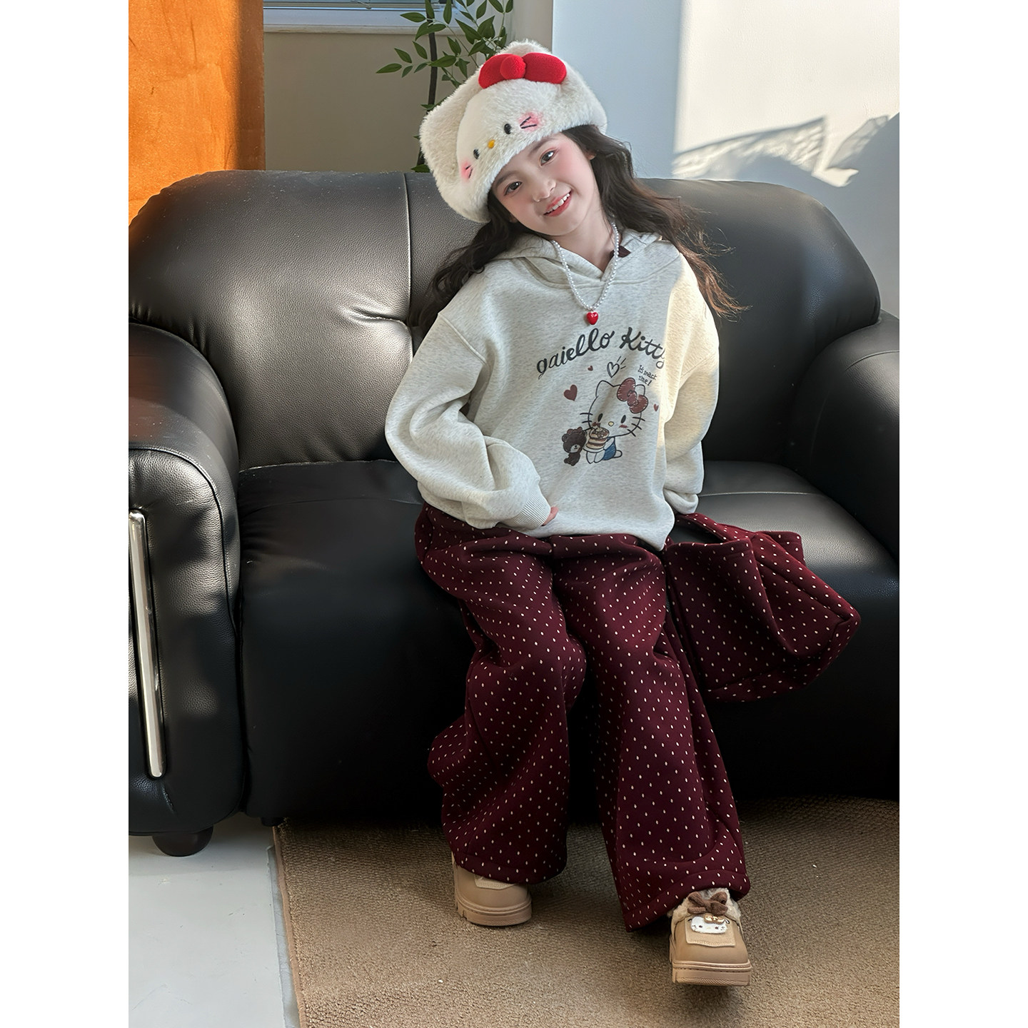 女童卫衣套装2025冬季新款儿童加绒卡通连帽上衣波点阔腿裤三件套